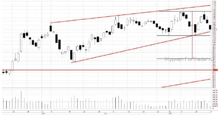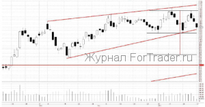 Рассмотрим обыкновенные акции Сбербанка с позиции технического анализа. Линия среднесрочного восходящего тренда проходит на текущий момент в районе 90 р. Последние два месяца котировки торгуются в рамках восходящего канала с текущими границами 104 — 112 р. Покупателям не удалось преодолеть сопротивление на 110 р., образовав при этом фигуру двойная вершина с поддержкой на 103 р. В случае реализации фигуры целью среднесрочного снижения будет выступать отметка на 96 р.