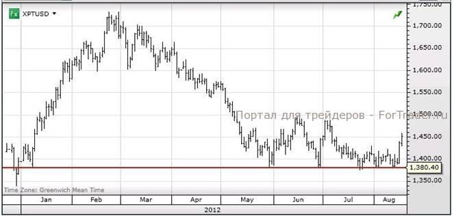 Этот металл отставал от золота больше месяца, пытаясь удержаться в области выше ключевой поддержки на 1380 долл. за унцию. Но в четверг все изменилось: шестидневная забастовка в шахте Marikana компании Lonmin, расположенная на Юге Африки и уже ставшая причиной гибели нескольких человек, превратилась в жестокую бойню, после того, как полиция убила 35 бастующих рабочих. Lonmin Plc, третий по величине производитель платины в мире и управляющий горнообрабатывающим комплексом, быстро свернул производство. Это привело к разговорам о том, что ожидаемый профицит производства сократится, если ситуация негативно повлияет на других крупных операторов Южной Африки. В этом регионе добывается более 60% мировых запасов платины.