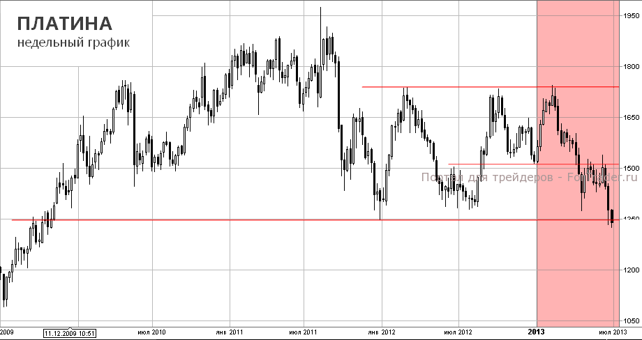 На фоне общей распродажи на рынке драгоценных металлов, цена платины в понедельник 24 июня обновила 5-ти летний минимум. Если неделя закроется ниже отметки $1350 за унцию, у медведей появится сильный технический сигнал к продолжению падения весны/лета текущего года. Тем не менее, эксперты компании CPM Group ожидают рост стоимости металла в конце этого года в силу проблем с предложением из-за трудовых конфликтов в ключевых добывающих регионах.