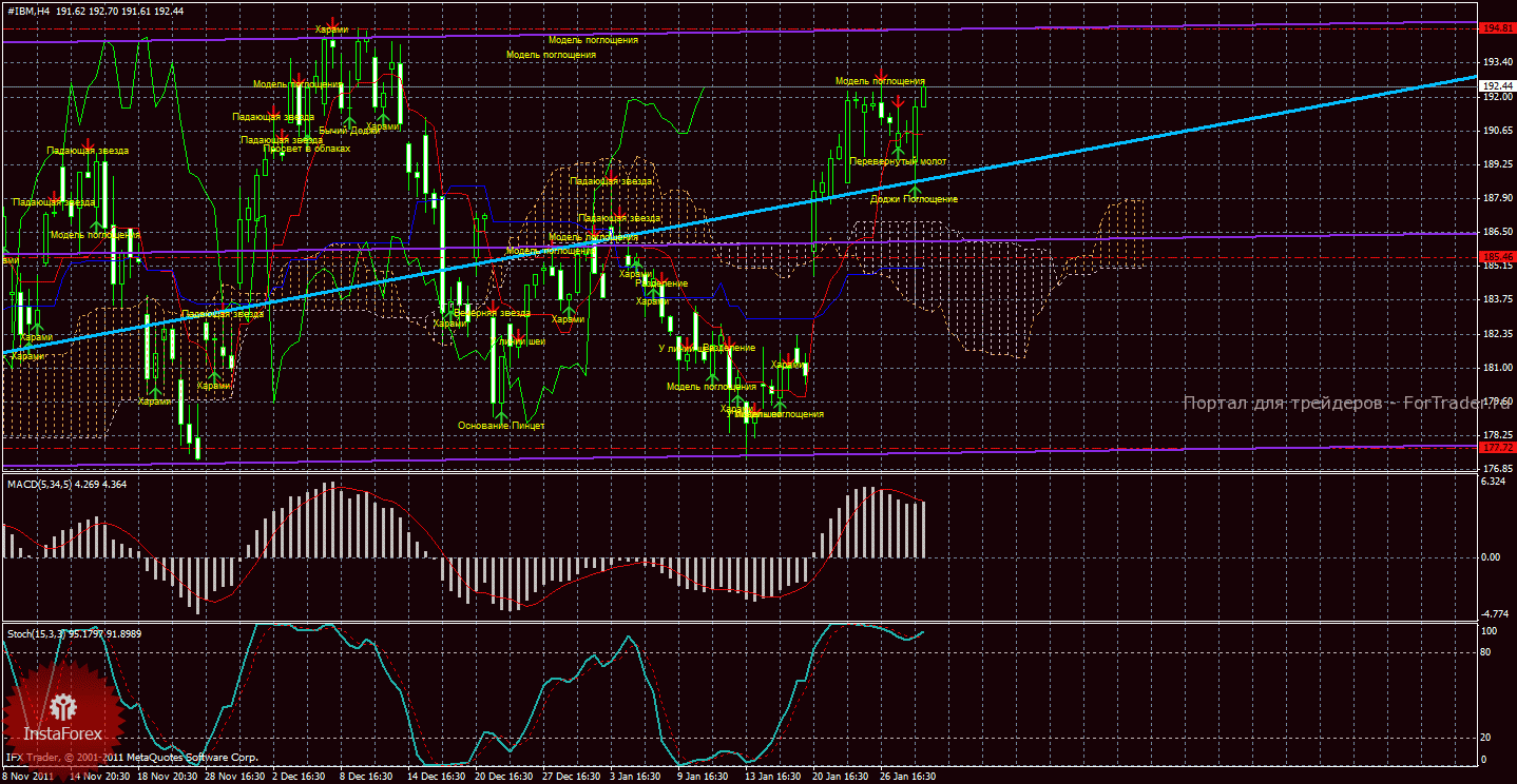 Анализируя график движения цены акций компании IBM Corporation, видно, что в последнее время курс движется в рамках бокового канала, который также является младшим каналом линейной регрессии. После уверенного роста после 12 января курс взял некоторую передышку и начал корректироваться. В общем же мы имеем продолжающий отрабатываться сигнал на покупку «золотой крест», который является и сильным и подтвержденным. Тот факт, что каналы линейной регрессии направлены в вверх и вбок позволяет нам рассматривать торговлю на повышение. Поэтому лонги сейчас актуальны, но после завершения небольшой коррекции, о которой продолжает сигнализировать MACD. C учетом вчерашнего роста, а также открытия сессии ниже закрытия предыдущей, скорее всего коррекция завершена. В пользу этого также говорит тот факт, что Стохастик так и не покинул зону перекупленности. При возобновлении же восходящего тренда целью будет выступать уровень сопротивления 194,81. При открытии лонгов, стоп — лосс выставляем ниже Киджун-сен, заход цены ниже этой линии будет означать ослабление текущего сигнала и поставит под сомнение дальнейший восходящий тренд. Последние сформированные комбинации «Поглощение», «Доджи» и «Перевернутый молот» являются сигналами на повышение и также сигнализируют о возможном возобновлении восходящего движения. MACD показывает коррекционное движение, однако, с учетом показаний других индикаторов, можно предположить, что он также на будущей сессии развернется наверх. Стохастик указывает на перекупленность курса, также допуская некоторое снижение, но пока он не покинул зону перекупленности, сохраняется именно восходящий тренд.