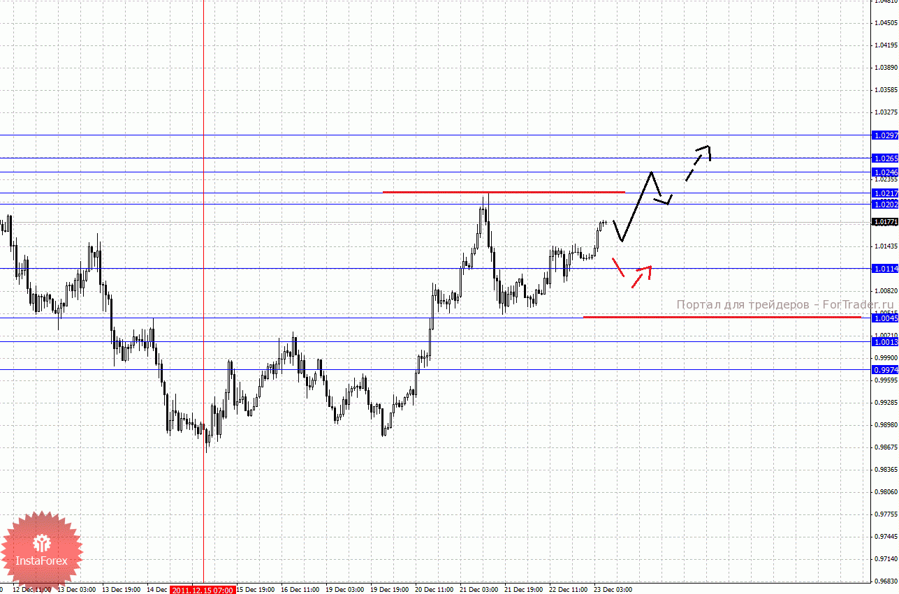По паре Австралийский доллар/Доллар ключевыми уровнями являются: 1.0297, 1.0265, 1.0246, 1.0217, 1.0202, 1.0114, 1.0045, 1.0013 и 0.9974. Здесь продолжения развития восходящей структуры от 15 декабря ожидаем после прохода ценой шумового диапазона 1.0202 – 1.0217, в данном случае цель 1.0246, в коридоре 1.0246 – 1.0265 консолидация цены. Потенциальным значением для верха считаем уровень 1.0297, по достижении которого, ожидаем откат книзу. Уровень 1.0114 является ключевой поддержкой для верха, его проход ценой будет располагать к развитию нисходящей структуры, в данном случае первая цель – 1.0045.