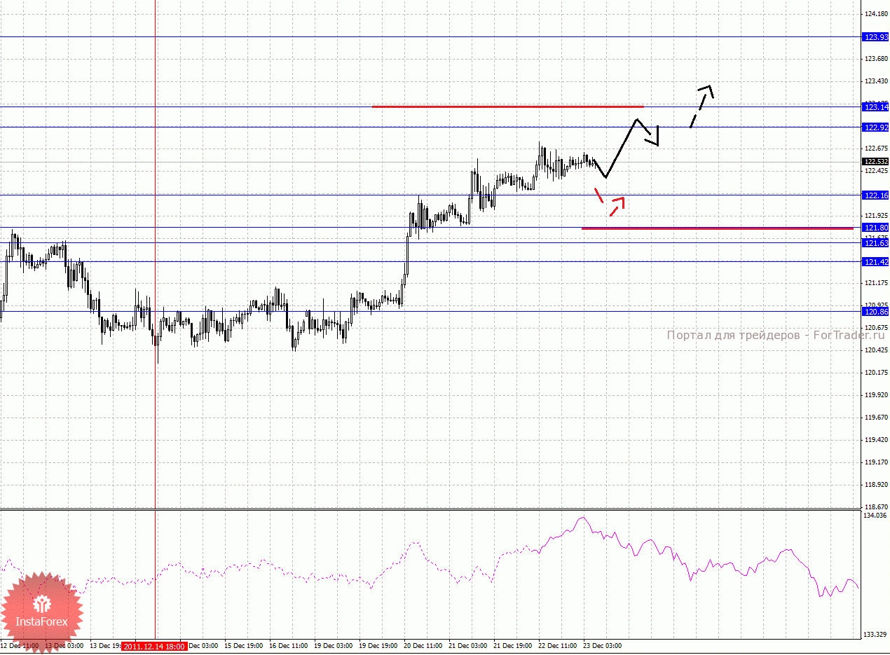 По паре Фунт/Йена ключевыми уровнями являются: 123.93, 123.14, 122.92, 122.16, 121.80, 121.63, 121.42 и 120.86. Здесь основные цели остались без изменения, и мы продолжаем следить за восходящей структурой от 14 декабря. В коридоре 122.92 – 123.14 консолидация цены, отсюда высока вероятность разворота книзу. Пробой уровня 123.14 будет сопровождаться неустойчивым движением кверху, здесь потенциальная цель – 123.93, однако уровень может быть не достигнут ценой, наиболее рационально работать от 123.93, при его достижении. Уровень 122.16 является ключевой поддержкой для верха, его пробой позволит рассчитывать на движение к 121.80, в коридоре 121.80 – 121.63 мы ожидаем краткосрочное нисходящее движение, пробой последнего значения приведет к движению до 121.42, от этого уровня мы ожидаем разворот кверху, его пробой окажет негативное влияние на развитие восходящей тенденции в масштабе Н1. Уровень 120.86 интересен с точки зрения среднесрочной перспективы.