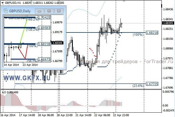 Пара GBPUSD направилась вверх, сломав медвежью модель, и рекомендация на продажу не исполнилась. Высока вероятность паре пойти выше, поэтому даю сегодня, рекомендацию на покупку. На эту неделю традиционно рассматриваю два варианта возможного движения цены, основной красный и альтернативный зеленый. Значимые уровни на сегодня отмечены на часовом графике. Индикатор АО находится в положительной зоне и растет, указывая на желание пары двигаться вверх в данное время. Индикатор тренда указывает на рост. Преодоление 1,6840 позволит купить с целями 1,6865, 1,6880 и 1,6900.