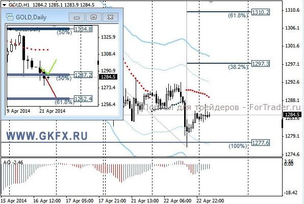 Цены на золото в соответствии с ожиданиями умеренно снижались, дав возможность взять только первую цель по рекомендации. Сделка на продажу открылась по 1282,0 и первая цель находилась на уровне 1278,0, после чего стоп необходимо было перенести на уровень открытия сделки. Так как позднее цены вернулись обратно, сделку закрыло по безубытку. Традиционно делаю два варианта движения цены на неделю, основной красный и альтернативный зеленый. Значимые уровни на сегодня отмечены на часовом графике. Индикатор АО находится в отрицательной зоне и растет, указывая на коррекцию перед возможным продолжением снижения. Индикатор тренда указывает на снижение. Преодоление 1277,0 позволит продать с целями 1270,0 и 1258,0.