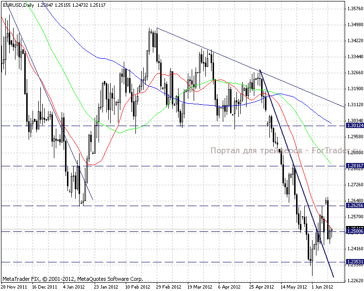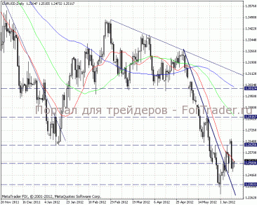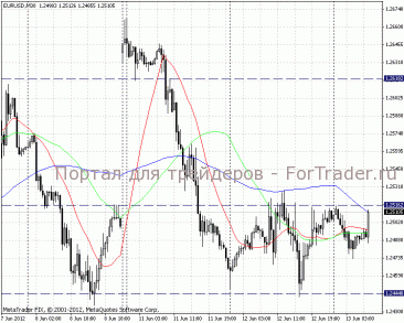 На вчерашней торговой сессии движения по единой европейской валюте были минимальными, цена актива не смогла пробить сильное сопротивление на отметке 1,2500. На дневном графике видно как вчерашний максимум свечи совпал с самой быстрой линией МА.