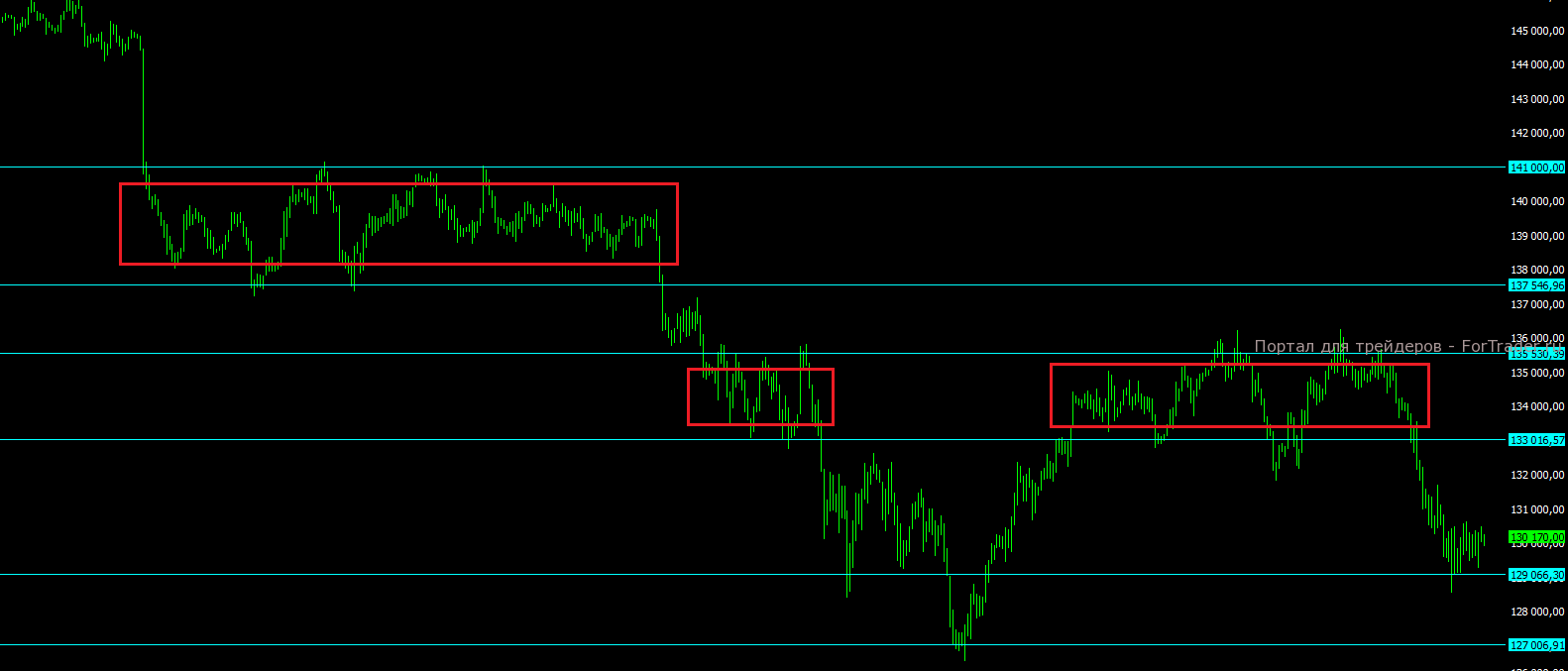 Фьючерс на индекс РТС практически весь вчерашний день провёл в узком коридоре 129000-130500 пунктов. Отметка 129000 пунктов является важной поддержкой и пока сохраняются все предпосылки, что она скоро не устоит. В случае отскока цены до отметки 133000 можно будет смело открывать короткие позиции ещё раз. Сегодня есть все шансы увидеть отскок до отметки 132000 пунктов.