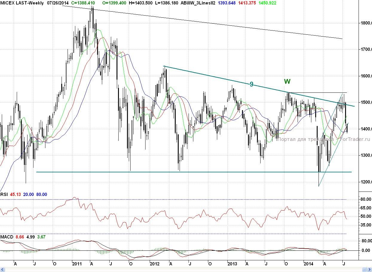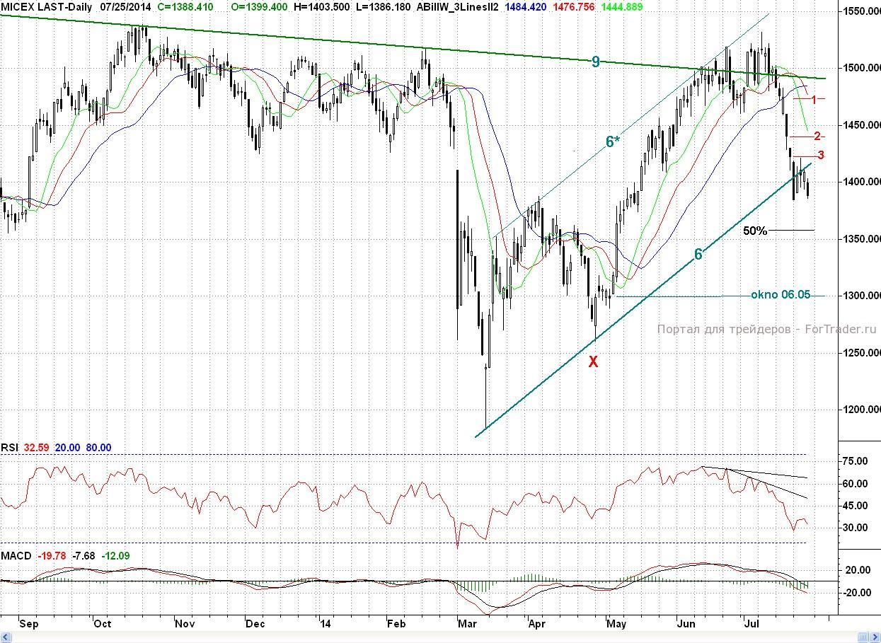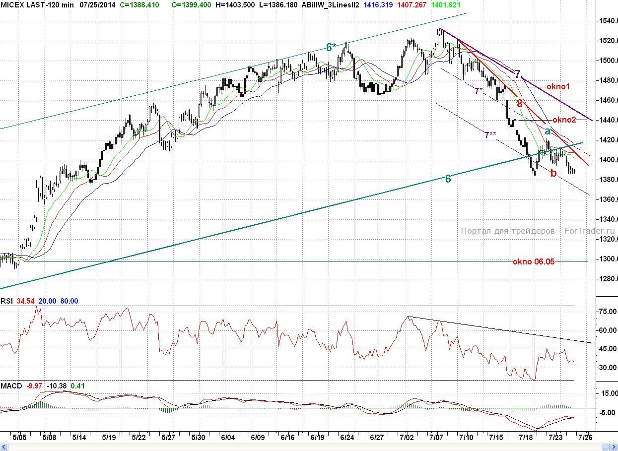 Таким образом, покупатели не сумели выполнить пятничную задачу, и прошедшая неделя снова завершилась негативно для них. С технической точки зрения минусом для покупателей является и то, что индекс ММВБ по 2 – часам снова вошел в продажу. По дням он там уже с 15 июля, а по неделям по итогам пятницы он вышел из покупки. При этом бычьих дивергенций не образовалось, но намечаются потенциальные. Ближайшей поддержкой выступит нижняя граница падающего канала (7-7**)(~1 370 п.) Основным бычьим редутом остается уровень 50% коррекции (~1 360 п.) от весенне — летнего роста. Роль ближайшего сопротивления сыграет утреннее окно, а далее бывшая пятничная поддержка b (1 394,05 п.).
