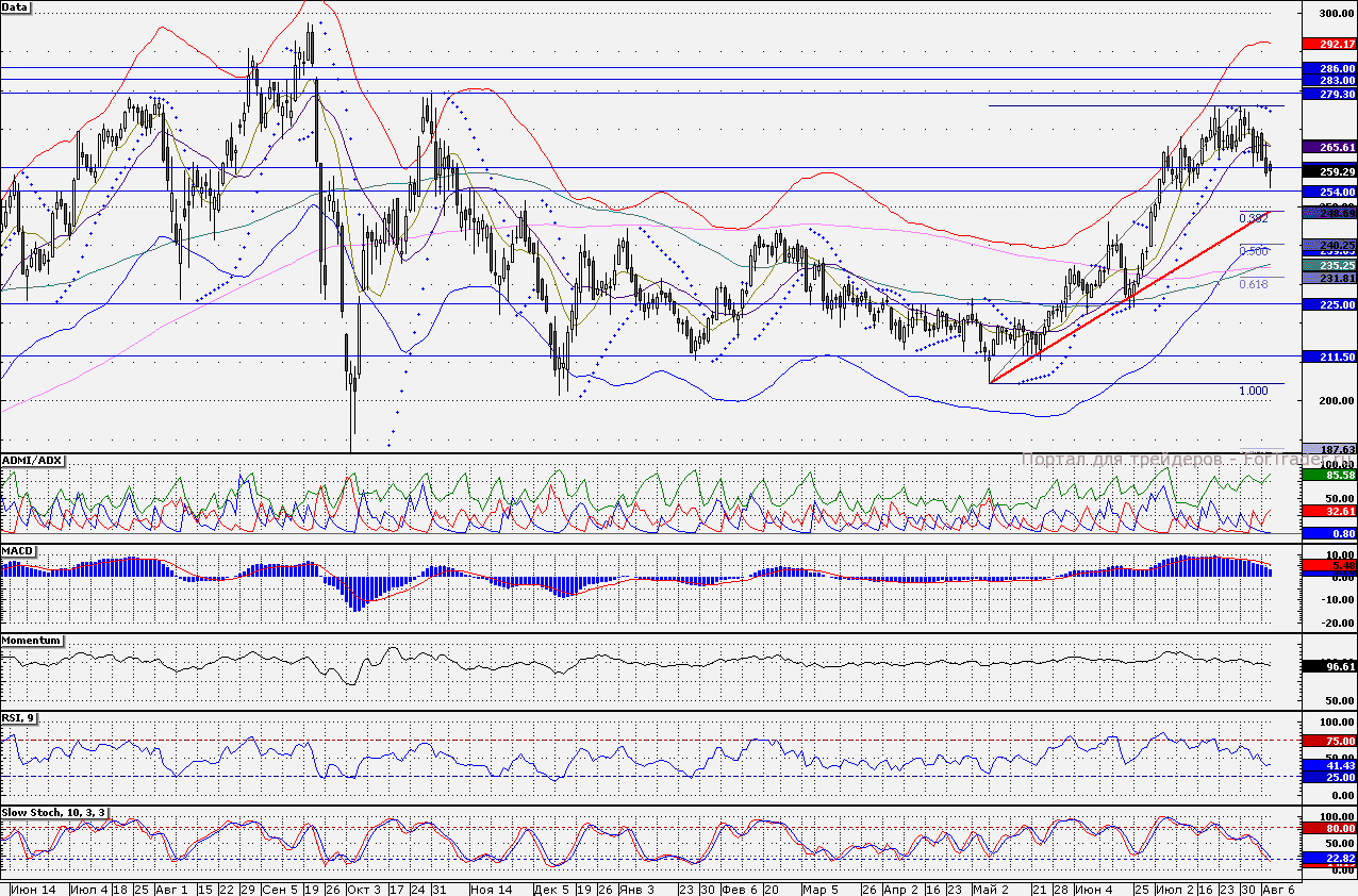 Акции «Уралкалия» на текущей недели ушли ниже 10- и 21- дневных скользящих средних, что может свидетельствовать о формировании нисходящей динамики акций. Целью для продолжения снижения выступает район 250 руб., где находится уровень 38,2% коррекции по Фибоначчи проведенной между минимумом конца мая и максимумом июля текущего года, кроме того, вблизи данной отметки проходит линия восходящего тренда актуального с мая текущего года. Судя по техническим сигналам вероятность продолжения нисходящей динамики достаточно велика. Таким образом, рекомендую удерживать короткие позиции по бумагам до достижения района 250 руб., и открывать новые длинные позиции только в случае появления сигналов на разворот у линии восходящего тренда.