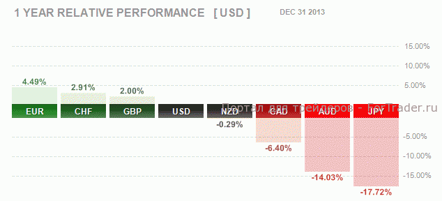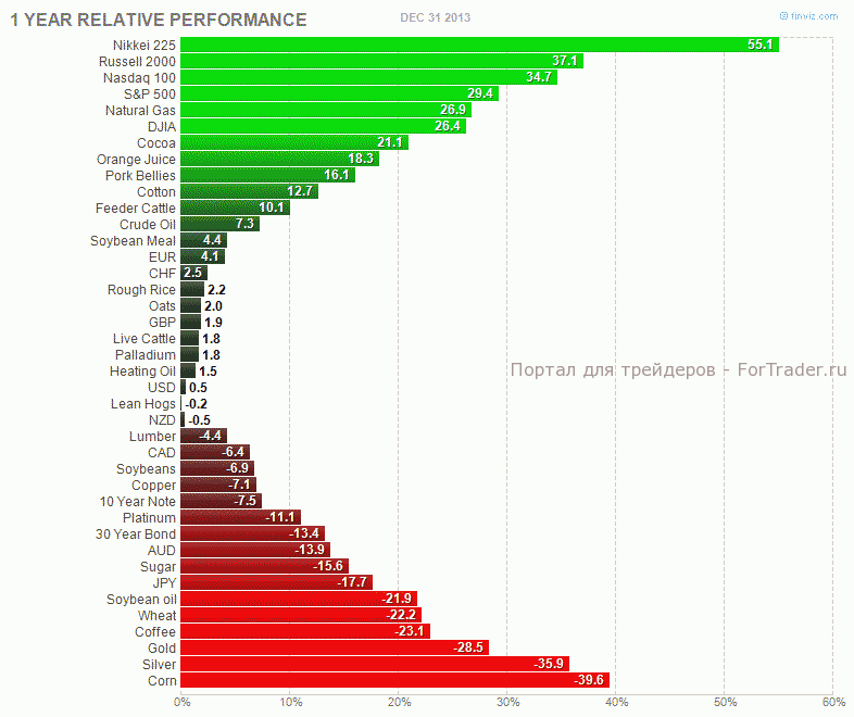 По итогам 2013 года наибольший рост среди развитых рынков показал японский фондовый индекс Nikkei 225 (+55,1%) — это лучшая динамика с 1972 года. Чуть меньший рост продемонстрировали американские фондовые индексы: Russell 2000, Nasdaq, S&P 500 и DJIA. Значительно выросли в цене природный газ, какао и апельсиновый сок. Главными аутсайдерами прошедшего года стали товарные активы: кроме серебра (-35,9%) и золота (-28,5%), показавших самое масштабное годовое падение с 1981 года — это кукуруза, кофе, пшеница, соевое масло и сахар.