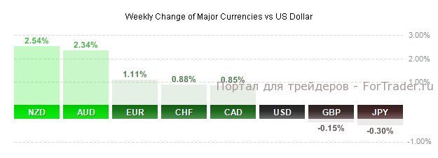 По итогам недели доллар США снизился к большинству основных валют, потеряв 0,8% по индексу доллара. Наибольший рост показали новозеландский и австралийский доллар. Чуть меньше по отношению к доллару выросли евро, швейцарский франк и канадский доллар. Доллар немного укрепился только к британскому фунту и йене.