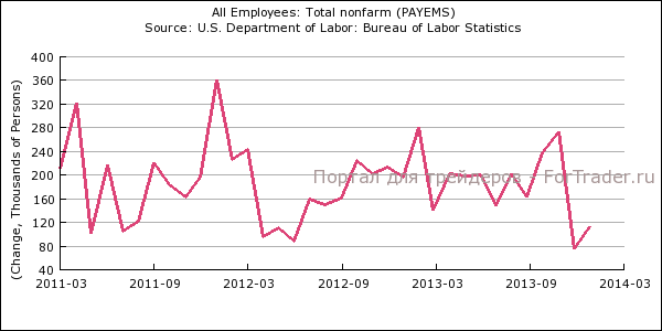 Согласно данным министерства труда число рабочих мест в США в несельскохозяйственных отраслях экономики выросло в январе всего на 113 тыс., после роста на 75 тыс. месяцем ранее, что оказалось более чем в полтора раза ниже прогноза. Пересмотр данных за два предыдущих месяца составил +34 тыс.