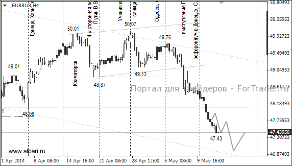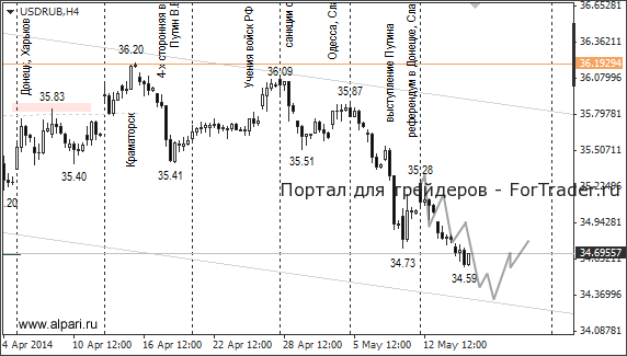 С 5 мая текущего года по курсу евро и доллара против рубля сформировался устойчивый медвежий тренд. Курс евро/рубль достиг отметки 47,43. Курс доллар/рубль снизился до 34,59. Рубль перестал реагировать на угрозы Штатов и Евросоюза и события на Украине. До тех пор, пока курсы доллара и евро торгуются ниже ценовых уровней 35,05 и 48 рублей, ближайшими целями выступят уровни 34,20 и 47 рублей.