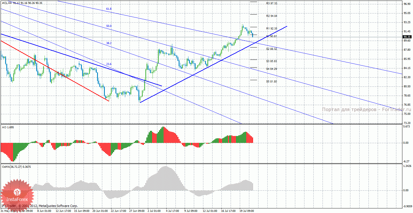 Анализ сырой нефти за 23 июля показывает, что курс сохраняет перспективы продолжения восходящего движения, сейчас инструмент немного корректируется. Целью для возможного дальнейшего восходящего движения выступают уровни сопротивления 92,35, 94,84, 97,33. Цели для возможной нисходящей коррекции – 88,32, 85,83, 84,29. Так как цена находится выше восходящей линии тренда, то восходящее движение более предпочтительно, а длинные позиции можно будет рассматривать после закрепления выше уровня R1 — 92,35. Веер уровней Фибоначчи четко указывает, что цена на данный момент скорректировалась к 61,8% и преодолела эту линию, что позволяет паре продолжить восходящее движение. Закрепление ниже 90,81 или закрепление ниже линии тренда засвидетельствует начало коррекции. Стоп лосс при торговле на повышение можно размещать ниже ближайшего уровня поддержки. Индикатор Awesome показывает текущее нисходящее движение, так как последний закрытый бар красного цвета. OsMA также направлен вниз, что говорит о нисходящем характере движения и в более долгосрочном плане.
