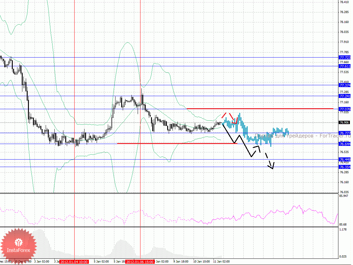 По паре Доллар/Йена ключевыми уровнями являются: 77.72, 77.61, 77.37. 77.24, 77.07, 76.77, 76.64, 76.44 и 76.35. Здесь восходящая структура от 4 января остается по-прежнему актуальной для определения целей. Ее отмены ожидаем после пробоя 76.77, в данном случае цель 76.64, в этом диапазоне небольшая консолидация. Пробой уровня 76.64 должен сопровождаться импульсивным движением к уровню 76.44. Потенциальным значением для низа считаем уровень 76.35, по достижении которого ожидаем консолидацию. Уровень 77.07 является ключевым сопротивлением для верха, его пробой позволит рассчитывать на движение к первой цели – 77.24. Далее ключевые уровни для верха остались без изменения.