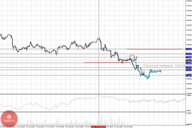 По паре Доллар/Франк ключевым уровня являются: 0.8955, 0.8904, 0.8868, 0.8808, 0.8761, 0.8733 и 0.8675. Здесь мы продолжаем следить за нисходящей структурой от 20 октября. Продолжения движения к низу, ожидаем после пробоя 0.8808, в данном случае цель 0.8761, в коридоре 0.8761 – 0.8733 консолидация цены. Потенциальным значением для низа, считаем уровень 0.8675, по достижении которого, ожидаем откат к верху. Корректировочное восходящее движение, возможно в диапазоне 0.8868 – 0.8904, пробой последнего значения приведет к углубленной коррекции, здесь цель 0.8955.