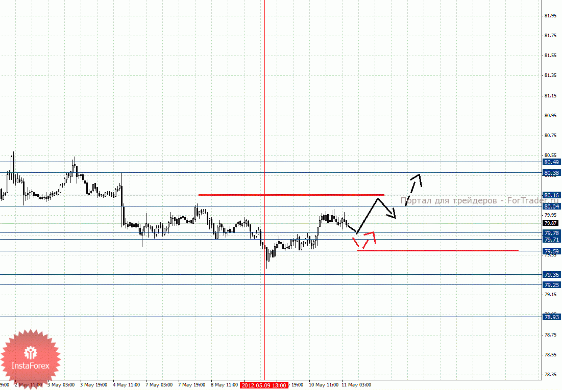 По паре Доллар/Йена ключевыми уровнями являются: 80.49, 80.38, 80.16, 80.04, 79.78, 79.71, 79.59, 79.36, 79.25 и 78.93. Здесь восходящую структуру от 9 мая мы рассматриваем в качестве потенциальных начальных условий для развития восходящего цикла. Краткосрочное движение кверху ожидаем в коридоре 80.04 – 80.16, пробой последнего значения должен сопровождаться импульсивным движением к уровню 80.38. Потенциальным значением для верха считаем уровень 80.49, по достижении которого ожидаем консолидированное движение в коридоре 80.38 – 80.49. Корректировочное нисходящее движение возможно в коридоре 79.78 – 79.71, пробой последнего значения приведет к углубленной коррекции, в данном случае цель – 79.59, от этого уровня высока вероятность разворота кверху, его пробой продолжит движение книзу, в данном случае первая цель – 79.36.