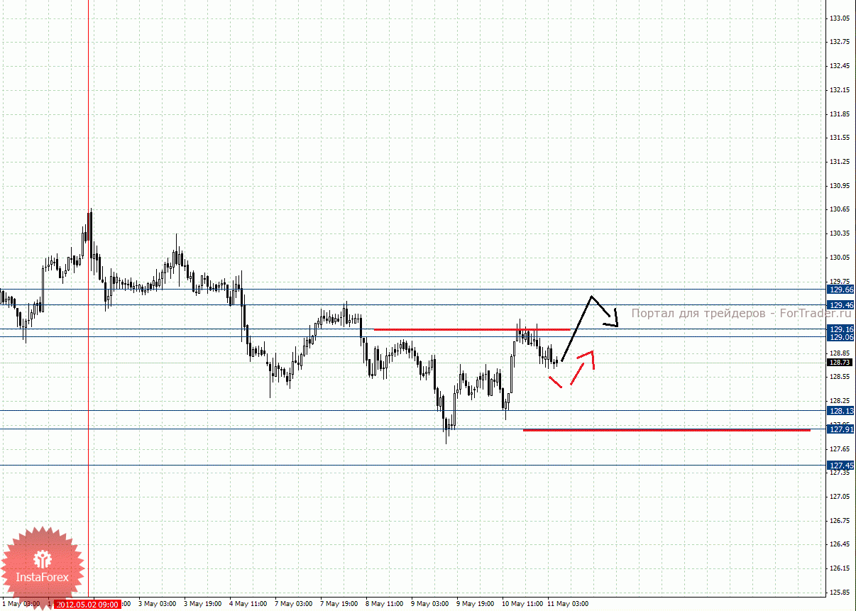 По паре Фунт/Йена ключевыми уровнями являются: 129.66, 129.46, 129.16, 129.06, 128.46, 128.13, 127.91 и 127.45. Здесь основные цели остались практически без изменения, однако стратегия сместилась в сторону восходящего движения. Краткосрочное нисходящее движения ожидаем в коридоре 128.13 – 127.91, пробой последнего значения позволит рассчитывать на движение к потенциальной цели – 127.45, по достижении которого ожидаем откат кверху. Диапазон 129.06 – 129.16 является ключевой поддержкой для нисходящей структуры, проход его ценой будет располагать к развитию восходящей тенденции, в данном случае первая цель 129.46. Потенциальным значением для верха считаем уровень 129.66, по достижении которого ожидаем консолидацию в коридоре 129.46 – 129.66.
