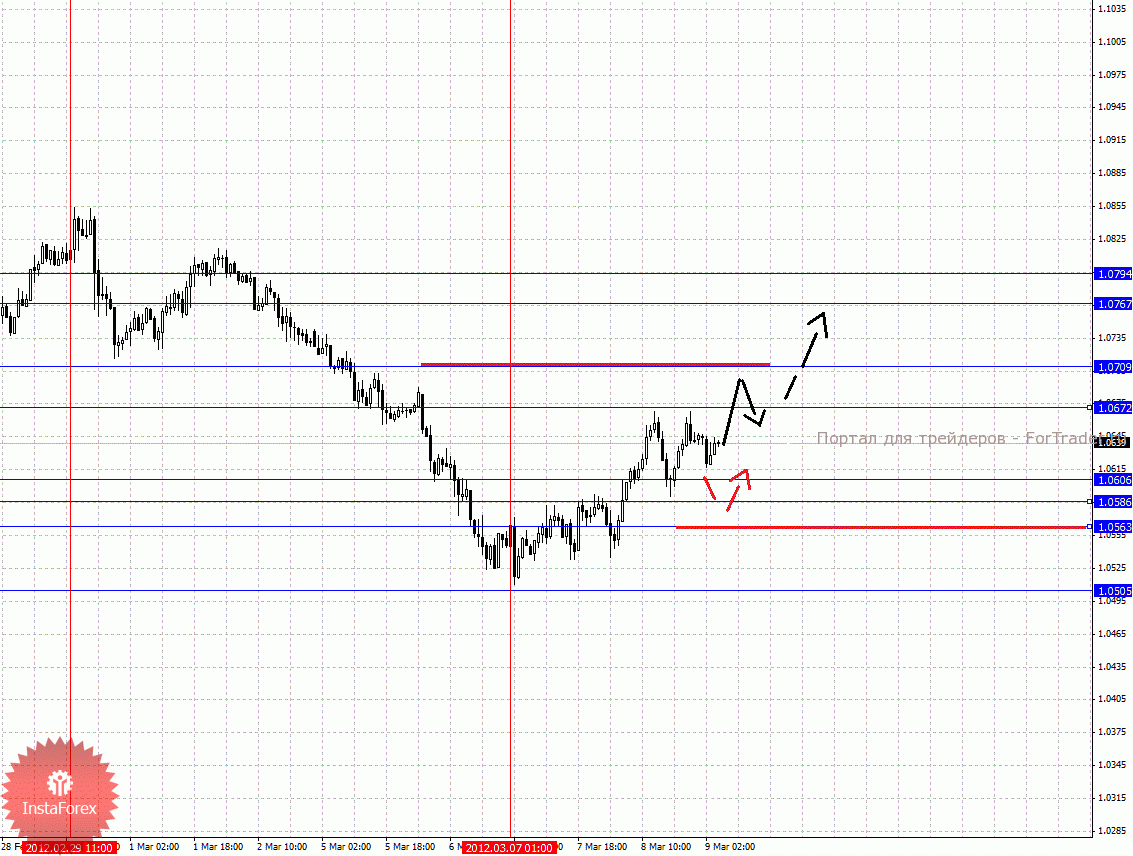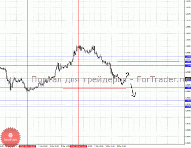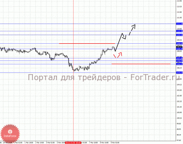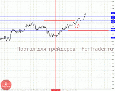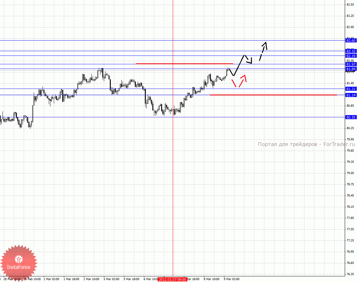 По паре Доллар/Йена ключевыми уровнями являются: 82.60, 82.32, 82.19, 81.97, 81.84, 81.31, 81.14 и 80.55. Здесь продолжения развития восходящей структуры от 7 марта ожидаем после прохода ценой шумового диапазона 81.84 – 81.97, в данном случае цель 82.19, в коридоре 82.19 – 82.32 консолидация цены. Потенциальным значением для верха считаем уровень 82.60, по достижении которого ожидаем откат книзу. Диапазон 81.31 – 81.14 является ключевой поддержкой для развития восходящей структуры, в нем мы ожидаем краткосрочное движение книзу. Пробой уровня 81.14 будет располагать к развитию нисходящей тенденции, в данном случае потенциальная цель 80.55.