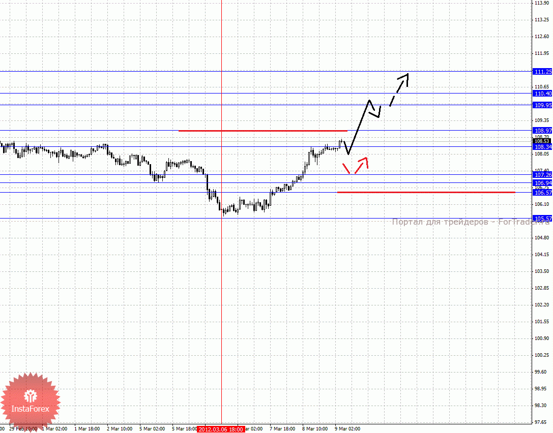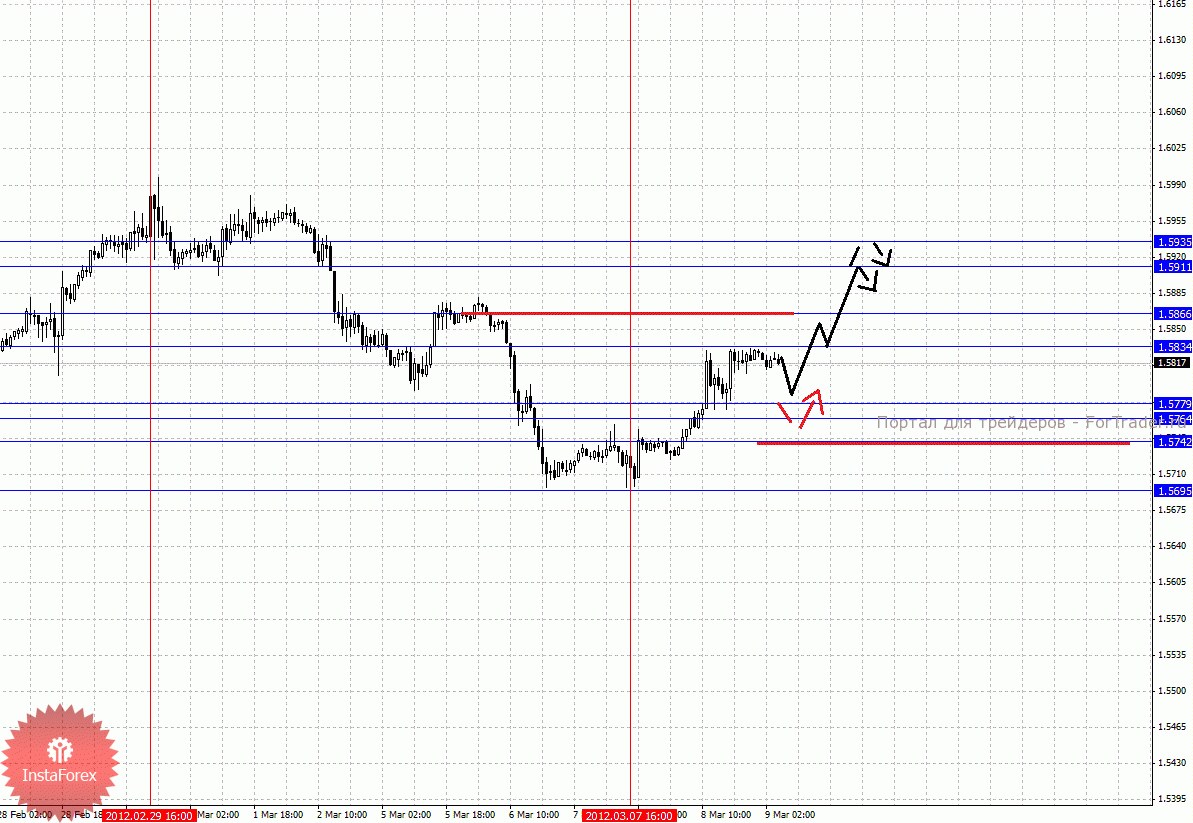 По паре Евро/Йена ключевыми уровнями являются: 111.25, 110.40, 109.95, 108.97, 108.34, 107.26, 106.94, 106.57 и 105.57. Здесь мы следим за формированием восходящей структуры от 6 марта. В коридоре 108.34 – 108.97 ожидаем консолидированное движение, пробой уровня 108.97 должен сопровождаться импульсивным движением к уровню 109.95. В коридоре 109.95 – 110.40 консолидация цены. Потенциальным значением для верха считаем уровень 111.25, движение к которому ожидаем после пробоя 110.40. Корректировочное нисходящее движение возможно в диапазоне 107.26 – 106.94, пробой последнего значения приведет к углубленной коррекции, здесь цель 106.57, от этого уровня высока вероятность разворота кверху, его пробой приведет к отмене восходящей структуры от 6 марта, в данном случае цель – 105.57.