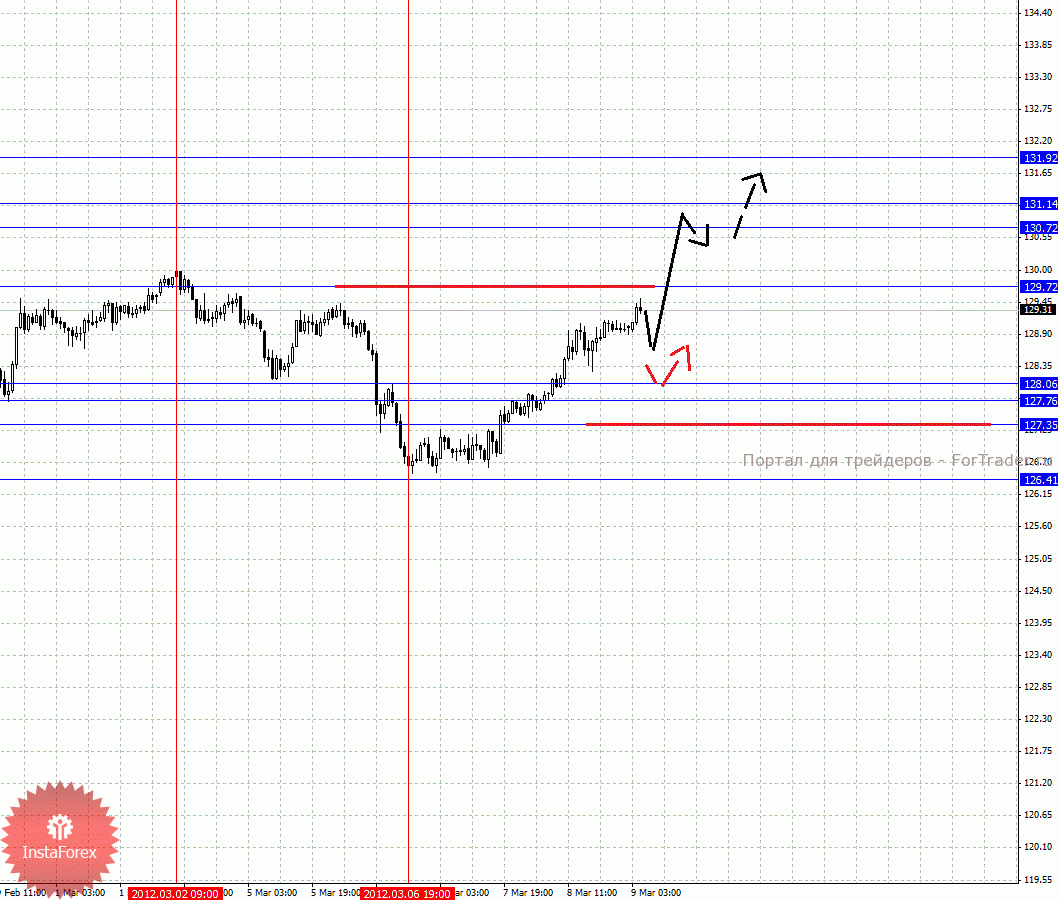 По паре Фунт/Йена ключевыми уровнями являются: 131.92, 131.14, 130.72, 129.72, 128.06, 127.76, 127.35 и 126.41. Здесь продолжения движения кверху ожидаем после пробоя 129.72, в данном случае цель 130.72, в коридоре 130.72 – 131.14 консолидация цены. Потенциальным значением для верха считаем уровень 131.92, по достижении которого ожидаем откат книзу. Корректировочное нисходящее движение возможно в диапазоне 128.06 – 127.76, пробой последнего значения приведет к углубленной коррекции, здесь цель 127.35, от этого уровня высока вероятность разворота кверху, его пробой отменит развитие восходящей структуры от 6 марта, в данном случае цель – 126.41.