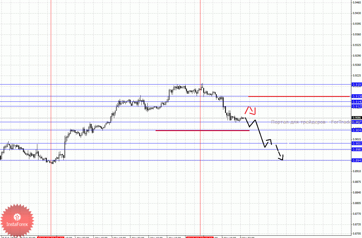 По паре Доллар/Франк ключевым уровня являются: 0.9197, 0.9158, 0.9140, 0.9125, 0.9073, 0.9047, 0.9003, 0.8983 и 0.8947. Здесь от 7 марта формируются потенциальные начальные условия для развития нисходящего цикла. Краткосрочное движение книзу ожидаем в коридоре 0.9073 – 0.9047, пробой последнего значения должен сопровождаться импульсивным движением к уровню 0.9003, в коридоре 0.9003 – 0.8983 консолидация цены. Потенциальным значением для низа считаем уровень 0.8947, по достижении которого ожидаем откат кверху. Корректировочное восходящее движение возможно в коридоре 0.9125 — 0.9140, пробой последнего значения приведет к углубленной коррекции, здесь цель 0.9158. От уровня 0.9158 высока вероятность разворота книзу, его пробой будет располагать к развитию восходящей структуры, в данном случае потенциальная цель 0.9197.