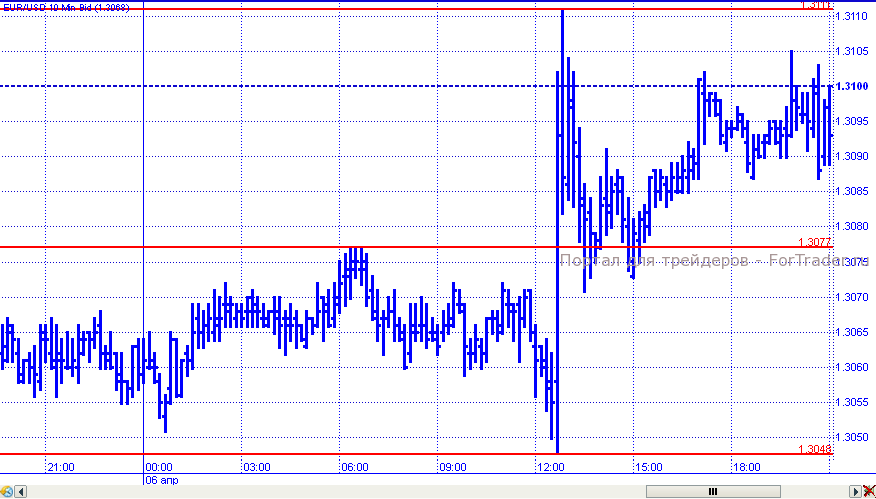 Последний рабочий день недели прошел относительно спокойно в силу того, что часть рынков была закрыта в связи с Пасхой. Вплоть до американской торговой сессии пара евро/доллар консолидировалась в пределах узкого диапазона, ограниченного уровнями 1,3048 – 1,3077. Однако, после публикации данных NFP евро смог немного укрепиться и достиг внутридневного максимума 1,3111, но достаточно резко откорректировал к отметке 1,3070. Торговые сутки пара завершила в районе уровня 1,3100.