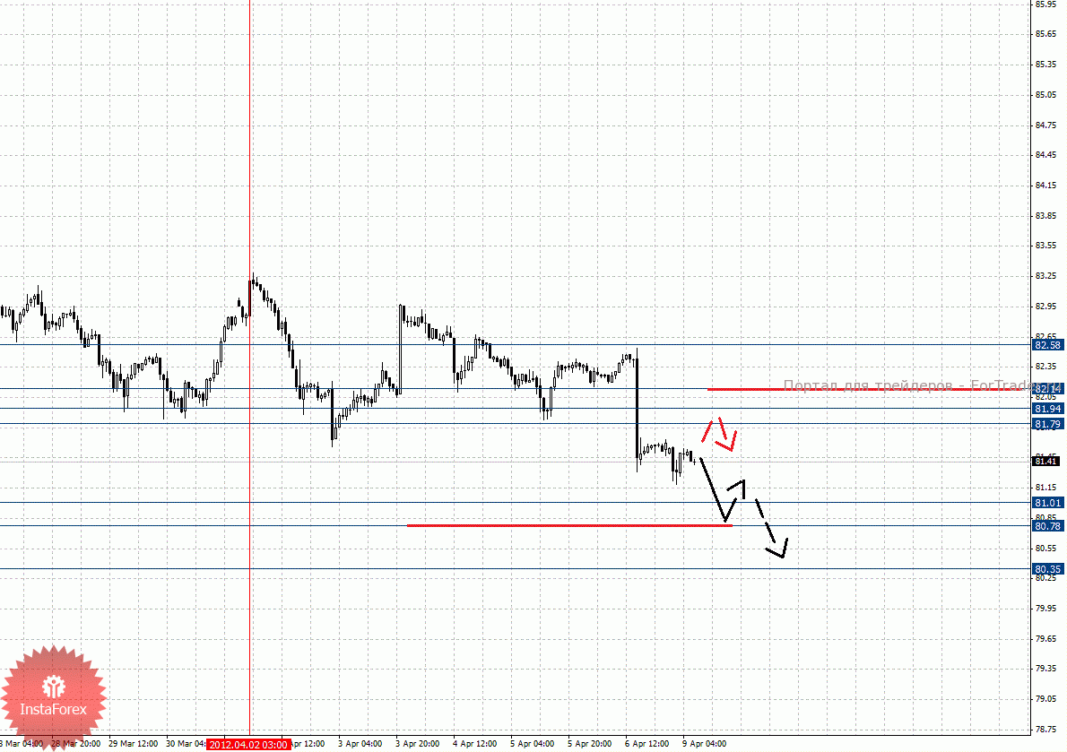 По паре Доллар/Йена ключевыми уровнями являются: 82.58, 82.14, 81.94, 81.79, 81.01, 80.78 и 80.35. Здесь мы продолжаем следить за нисходящей структурой от 2 апреля. Потенциальной целью для низа, на текущий момент, является уровень 81.01, по достижении которого, ожидаем консолидированное движение в коридоре 81.01 – 80.78, пробой последнего значения позволит рассчитывать на движение к 80.35, от которого ожидаем откат кверху. Корректировочное восходящее движение возможно в коридоре 81.79 – 81.94, пробой последнего значения приведет к углубленной коррекции, здесь цель 82.14, от этого уровня высока вероятность разворота книзу, его пробой будет располагать к развитию восходящей структуры, в данном случае потенциальная цель – 82.58.