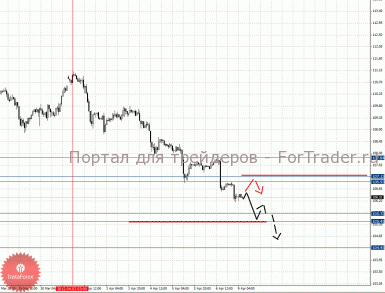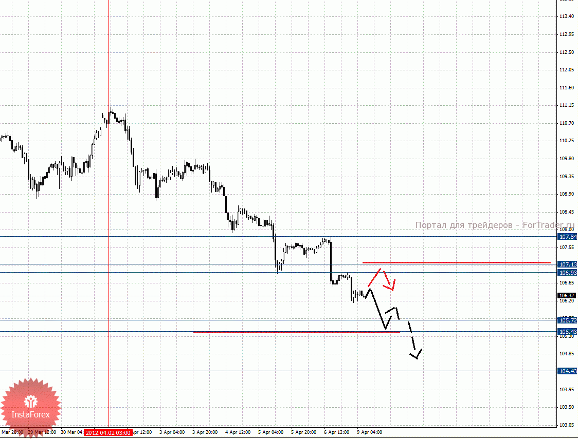 По паре Евро/Йена ключевыми уровнями являются: 107.84, 107.13, 106.93, 105.72, 105.43 и 104.43. Здесь потенциальной целью для нисходящей структуры от 2 апреля является уровень 105.72, по достижении которого ожидаем консолидированное движение в коридоре 105.72 – 105.43. Пробой уровня 105.43 продолжит движение книзу, в данном случае цель 104.43, по достижении этой цели ожидаем откат кверху. Диапазон 106.93 – 107.13 является ключевой поддержкой для низа, его проход ценой будет располагать к развитию восходящей структуры, в данном случае потенциальная цель – 107.84. До уровня 107.84 мы ожидаем оформления начальных условий для развития восходящего цикла.