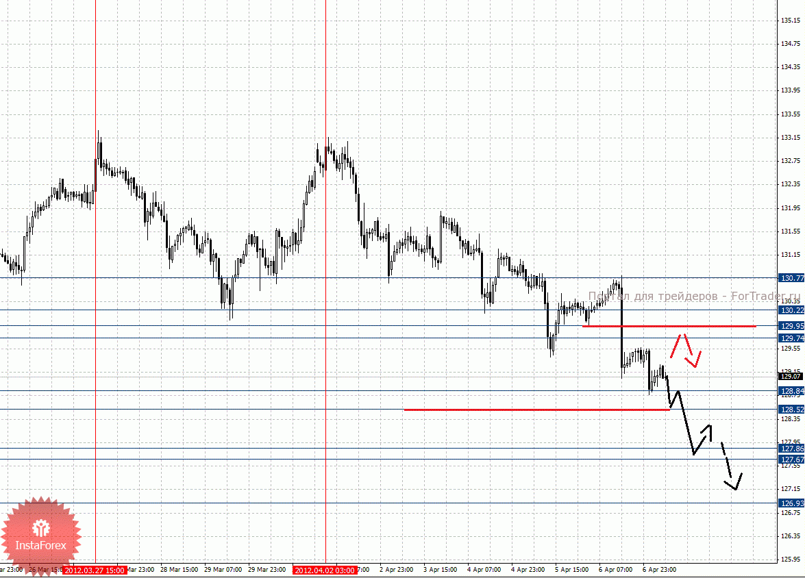 По паре Фунт/Йена ключевыми уровнями являются: 130.77, 130.22, 129.95, 129.74, 128.84, 128.52, 127.86, 127.67 и 126.93. Здесь мы продолжаем следить за нисходящей структурой от 2 апреля. Краткосрочное движение книзу ожидаем в коридоре 128.84 – 128.52, пробой последнего значения должен сопровождаться выраженным нисходящим движением к уровню 127.86, в коридоре 127.86 – 127.67 консолидация цены. Потенциальным значением для низа считаем уровень – 126.93, по достижении которого ожидаем откат кверху. Краткосрочное восходящее движение возможно в коридоре 129.74 – 129.95, пробой последнего значения приведет к углубленной коррекции, здесь цель – 130.22, от этого уровня мы ожидаем разворот книзу, его пробой будет располагать к формированию восходящей структуры, в данном случае потенциальная цель – 130.77.