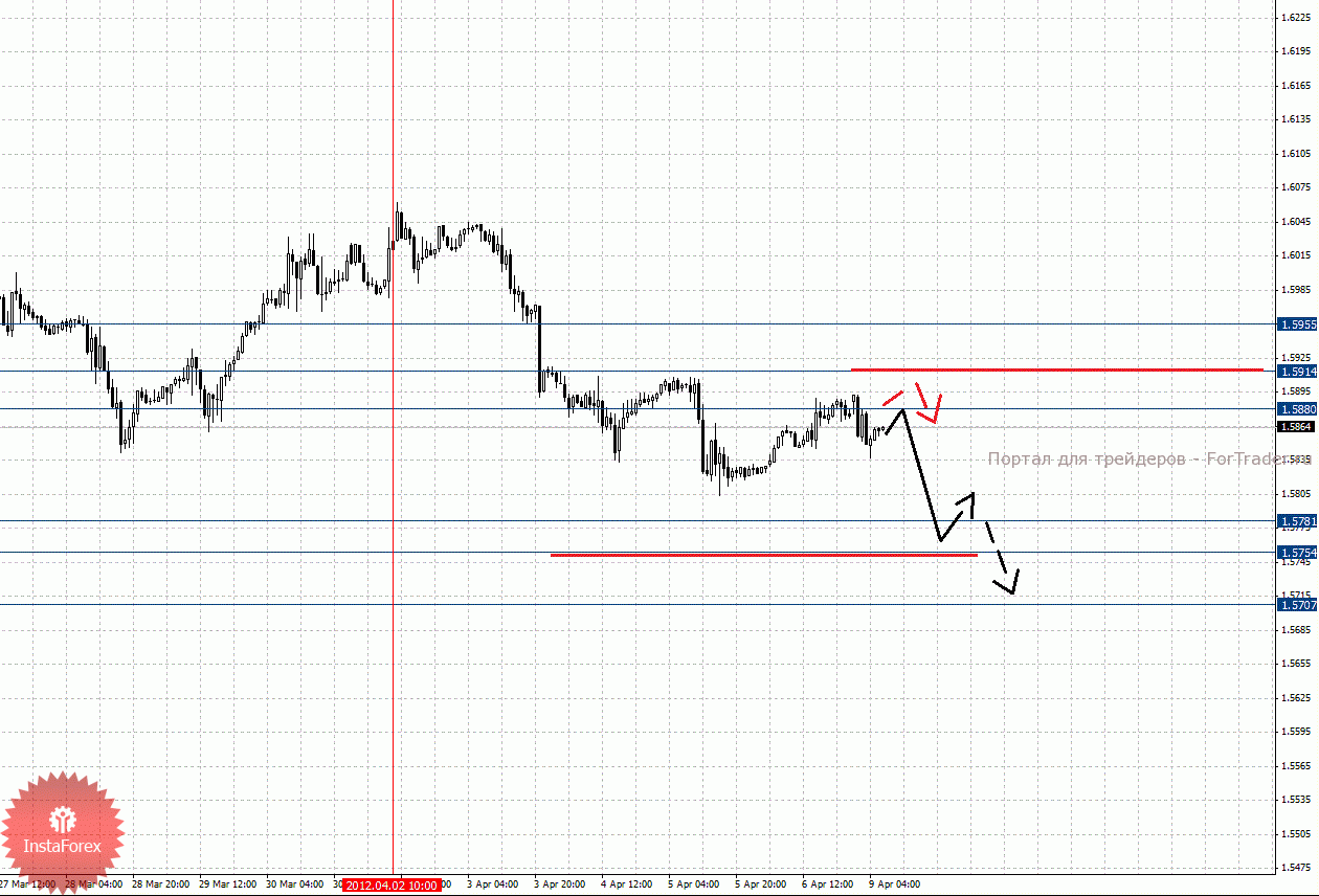 По паре Фунт/Доллар ключевыми уровнями являются: 1.5955, 1.5913, 1.5880, 1.5781, 1.5754 и 1.5707. Здесь мы продолжаем следить за нисходящей структурой от 2 апреля. Потенциальной целью для низа, на текущий момент, является уровень 1.5781, по достижении которого, ожидаем консолидированное движение в коридоре 1.5781 – 1.5754, пробой последнего значения приведет к выраженному нисходящему движению, в данном случае цель – 1.5707. Краткосрочное восходящее движение ожидаем в коридоре 1.5880 – 1.5913, пробой последнего значения окажет негативное влияние на развитие нисходящей структуры от 2 апреля, в данном случае потенциальная цель – 1.5955, до этого уровня ожидаем оформления начальных условий для восходящего цикла.