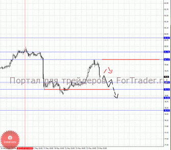 По паре Доллар/Йена ключевыми уровнями являются: 80.83, 80.38, 80.13, 79.39, 79.15, 78.88 и 78.47. Здесь цена по-прежнему находится в области формирования начальных условий для нисходящего движения от 16 мая. Краткосрочное движение книзу ожидаем в коридоре 79.39 – 79.15, отсюда существует вероятность разворота кверху, пробой уровня 79.15 продолжит движение книзу, в данном случае первая цель 78.88. В качестве потенциального значения для низа рассматриваем уровень 78.47, движение к которому ожидаем после пробоя 78.85. Краткосрочное восходящее движение возможно в коридоре 80.13 – 80.38, пробой последнего значения приведет к выраженному восходящему движению, здесь потенциальная цель – 80.83.