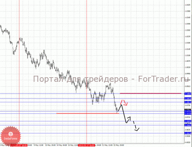 По паре Австралийский доллар/Доллар ключевыми уровнями являются: 0.9864, 0.9835, 0.9811, 0.9753, 0.9739, 0.9691, 0.9667 и 0.9616. Здесь локальный нисходящий цикл от 17 мая мы рассматриваем в качестве отчетной точки для последующих целей. Продолжения движения книзу ожидаем после прохода ценой шумового диапазона 0.9753 – 0.9739, в данном случае цель 0.9691, в коридоре 0.9691 – 0.9667 консолидация цены. Потенциальным значением для нисходящей структуры считаем уровень 0.9616, по достижении которого ожидаем откат кверху. Корректировочное восходящее движение ожидаем в коридоре 0.9811 – 0.9835, пробой последнего значения приведет к углубленной коррекции, в данном случае потенциальная цель – 0.9864.