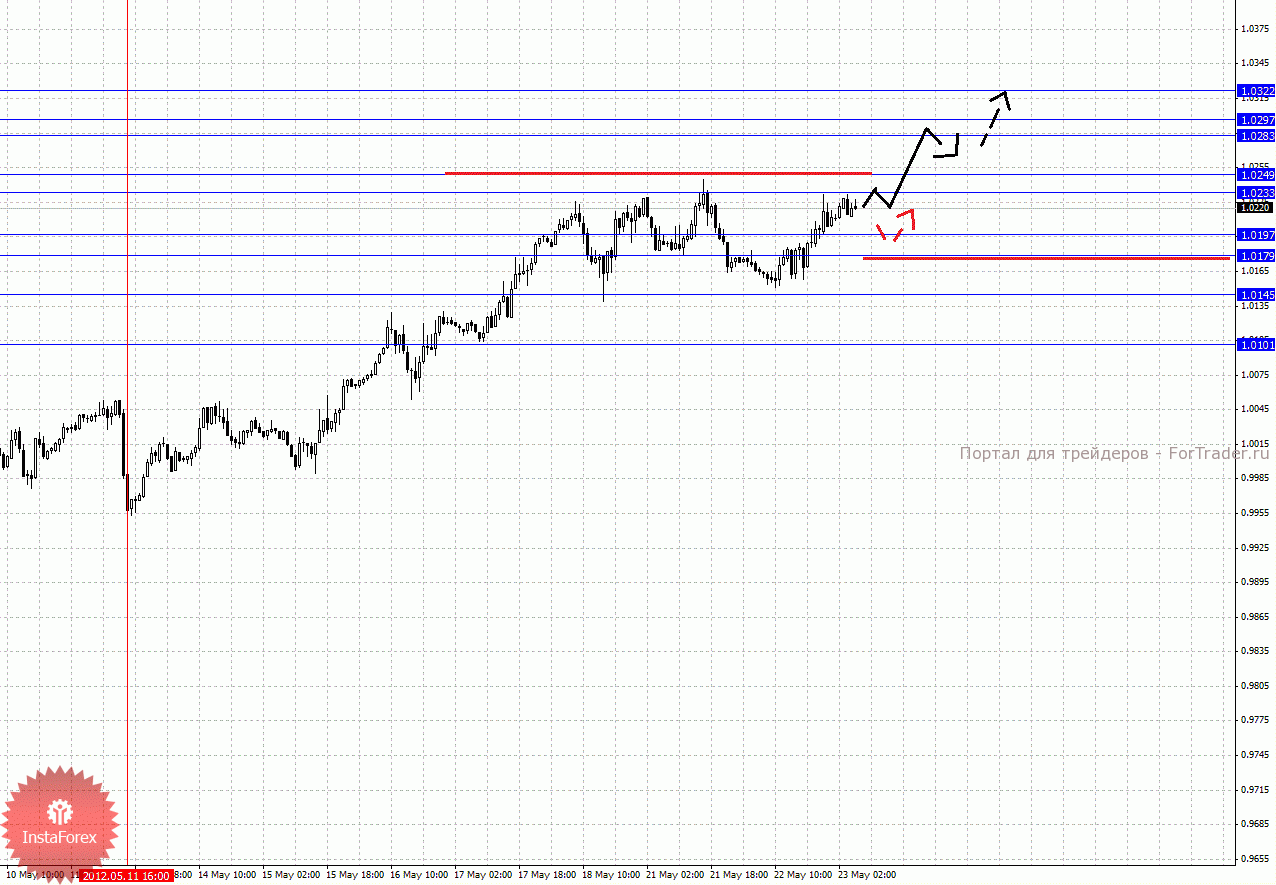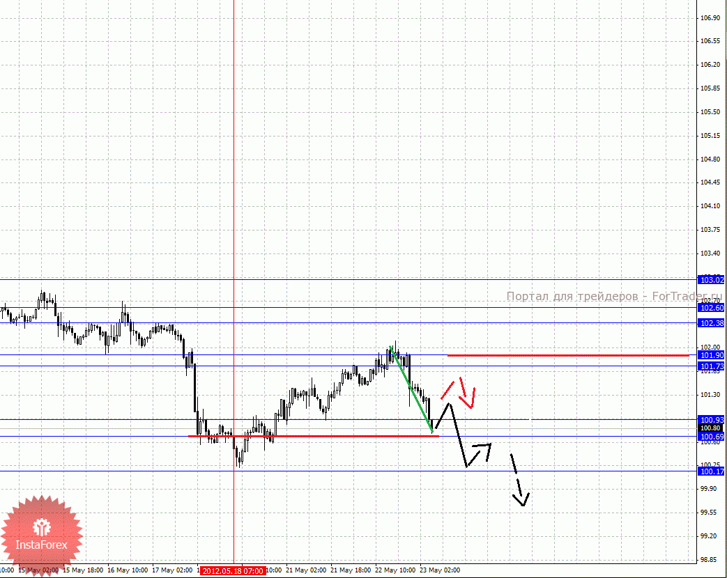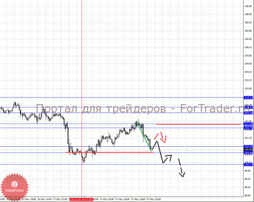 По паре Евро/Йена ключевыми уровнями являются: 103.02, 102.60, 102.38, 101.90, 101.73, 100.93, 100.69 и 100.17. Здесь продолжения развития восходящей структуры от 18 мая ожидаем после прохода ценой шумового диапазона 101.73 – 101.90, в данном случае цель 102.38, в коридоре 102.38 – 102.60 консолидация цены. Потенциальным значением для верха считаем уровень 103.02, по достижении которого ожидаем откат книзу. Диапазон 100.93 – 100.69 является ключевой поддержкой для верха, его проход ценой приведет к отмене развития восходящей структуры и здесь потенциальная цель – 100.17.