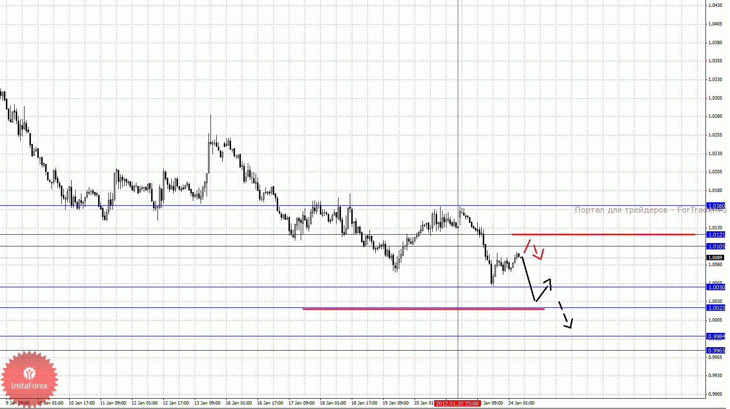 По паре Доллар/Канадский доллар ключевыми уровнями являются: 1.0160, 1.0121, 1.0105, 1.0050, 1.0023, 0.9984 и 0.9965. Здесь цена отменила развитие восходящей структуры, и на текущий момент мы следим за формированием локального потенциала для развития нисходящего движения от 20 января. Краткосрочное нисходящее движение ожидаем после пробоя 1.0050, в данном случае цель 1.0023, в этом диапазоне консолидация цены. Пробой уровня 1.0023 должен сопровождаться импульсивным движением к уровню 0.9984. Потенциальным значением для низа считаем уровень 0.9965, по достижении которого ожидаем консолидацию в коридоре 0.9984 – 0.9965. Диапазон 1.0105 – 1.0121 является ключевой поддержкой для низа, в нем мы ожидаем краткосрочное восходящее движение, пробой уровня 1.0121 будет располагать к развитию восходящей структуры, в данном случае потенциальная цель 1.0160.