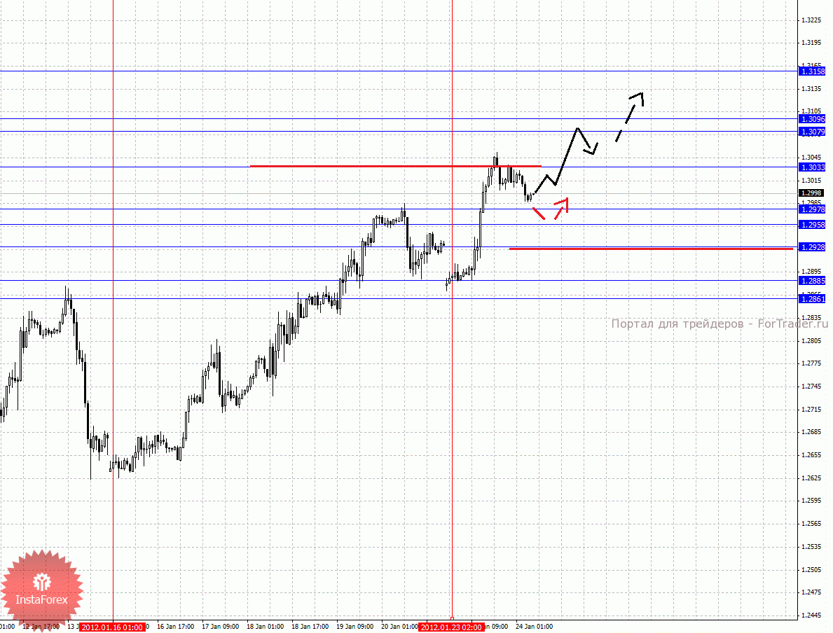 По паре Евро/Доллар важными уровнями являются: 1.3158, 1.3096, 1.3079, 1.3033, 1.2978, 1.2958, 1.2928, 1.2885 и 1.2861. Здесь продолжения движения кверху ожидаем после пробоя 1.3033, в данном случае цель 1.3079, в коридоре 1.3079 – 1.3096 консолидация цены. Потенциальным значением для верха считаем уровень 1.3158, движение к которому ожидаем после пробоя 1.3096. Корректировочное нисходящее движение возможно в диапазоне 1.2978 – 1.2958, пробой последнего значения приведет к углубленной коррекции, здесь цель 1.2928, от этого уровня мы ожидаем последний разворот кверху, его пробой будет располагать к развитию нисходящей структуры, в данном случае первая цель – 1.2885. Диапазон 1.2885 – 1.2861 шумовой.