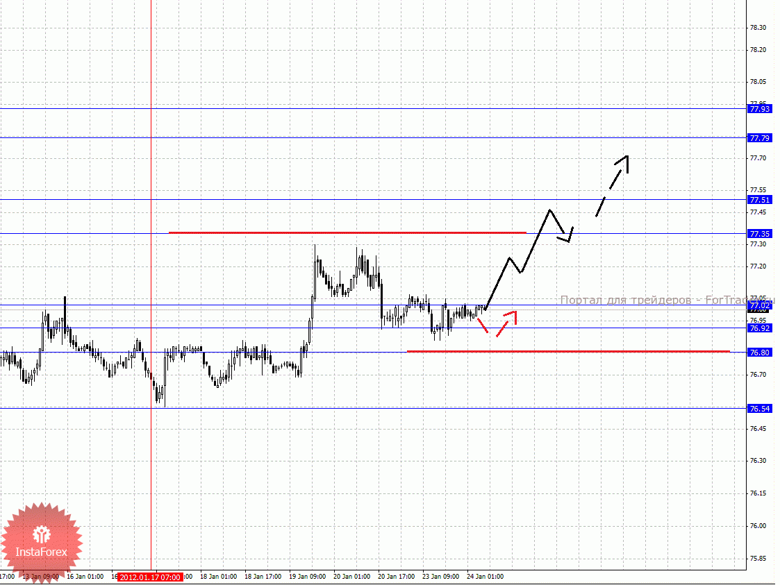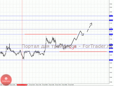 По паре Доллар/Йена ключевыми уровнями являются: 77.93, 77.79, 77.51, 77.35, 77.02, 76.92, 76.80 и 76.54. Здесь мы продолжаем следить за восходящей структурой от 17 января. Краткосрочное движение к верху ожидаем в диапазоне 77.35 – 77.51, пробой последнего значения должен сопровождаться импульсивным движением к уровню 77.79. В коридоре 77.79 – 77.93 консолидация цены. Корректировочное нисходящее движение возможно в коридоре 77.02 – 76.92, пробой последнего значения приведет к углубленной коррекции, здесь цель 76.80, от этого уровня мы ожидаем разворот кверху, его пробой приведет к отмене развития восходящей структуры от 17 января, в данном случае первая цель 76.54.