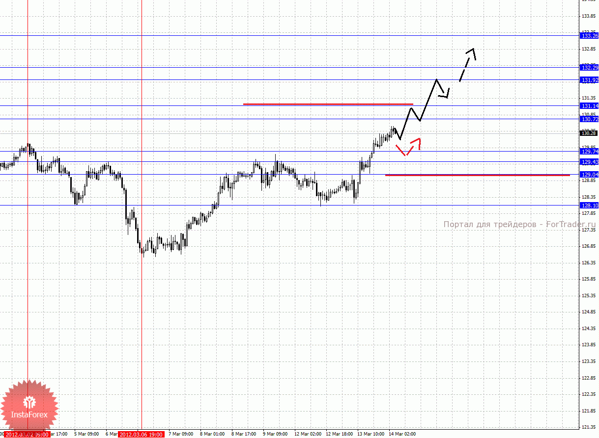 По паре Фунт/Йена ключевыми уровнями являются: 133.26, 132.29, 131.92, 131.14, 130.72, 129.74, 129.43, 129.04 и 128.10. Здесь мы продолжаем следить за развитием восходящей структуры от 6 марта. Краткосрочное восходящее движение ожидаем в коридоре 130.72 – 131.14, пробой последнего значения должен сопровождаться выраженным движением кверху, в данном случае цель 131.92, в коридоре 131.92 – 132.29 консолидация цены. Потенциальным значением для верха считаем уровень 133.26, по достижении которого ожидаем откат кверху. Корректировочное нисходящее движение возможно в коридоре 129.74 – 129.43, пробой последнего значения приведет к углубленной коррекции, здесь цель 129.04, от этого уровня есть вероятность разворота кверху, его пробой будет располагать к развитию нисходящей структуры, в данном случае потенциальная цель 128.10.