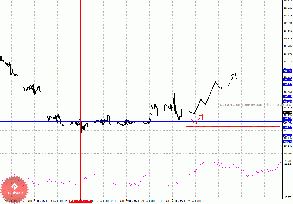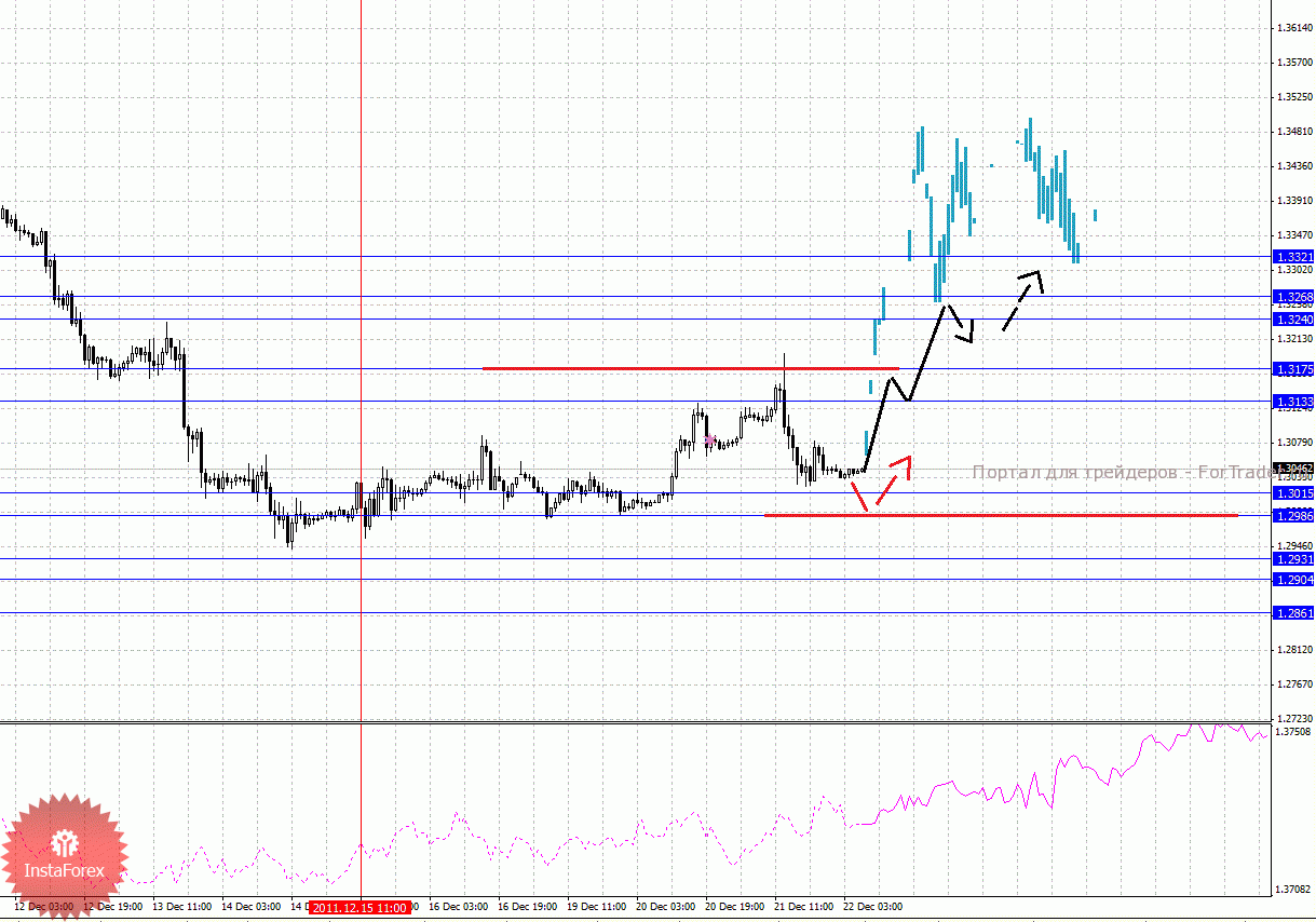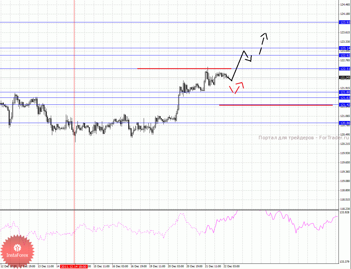 По паре Доллар/Франк ключевым уровня являются: 0.9549, 0.9504, 0.9480, 0.9428, 0.9389, 0.9317, 0.9289, 0.9260, 0.9211 и 0.9172. На поведение данной валюты сегодня необходимо обратить особое внимание. Здесь мы наблюдаем формирование восходящего потенциала от 21 декабря, что в свою очередь может изменить ситуацию по паре Евро/Доллар. Краткосрочное движение кверху ожидаем в диапазоне 0.9389 – 0.9428, пробой последнего значения должен сопровождаться импульсивным движением к уровню 0.9480, в коридоре 0.9480 – 0.9504 консолидация цены. Потенциальным значением для верха считаем уровень 0.9549, по достижении которого ожидаем откат книзу. Корректировочное нисходящее движение возможно в коридоре 0.9317 – 0.9289, пробой последнего значения окажет негативное влияние на развитие восходящей структуры от 21 декабря, здесь цель 0.9260, пробой которого, в свою очередь, продолжит нисходящее движение от 15 декабря, в данном случае первая цель 0.9211.