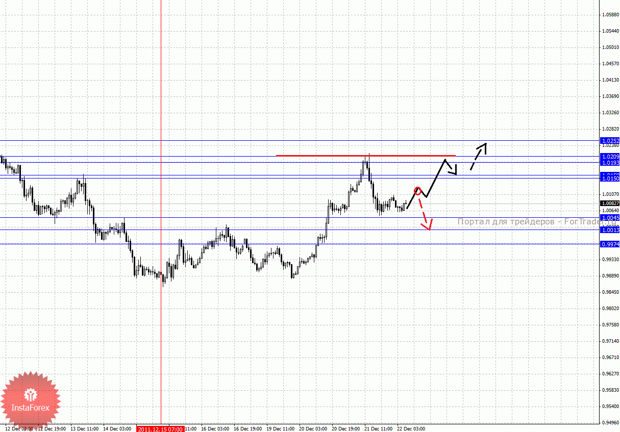 По паре Австралийский доллар/Доллар ключевыми уровнями являются: 1.0252, 1.0209, 1.0193, 1.0159, 1.0150, 1.0045, 1.0013 и 0.9974. Здесь ключевые цели остались без изменения. Продолжения движения кверху ожидаем после прохода ценой шумового диапазона 1.0150 – 1.0159, в данном случае цель 1.0193, в коридоре 1.0193 – 1.0209 консолидация цены. Потенциальным значением для верха считаем уровень 1.0252, по достижении которого, ожидаем консолидацию. Корректировочное нисходящее движение возможно в диапазоне 1.0045 – 1.0013, пробой последнего значения окажет негативное влияние на развитие восходящей структуры от 15 декабря, в данном случае потенциальная цель 0.9974. До уровня 0.9974 уже должны будут оформиться начальные условия для последующего развития нисходящей тенденции.