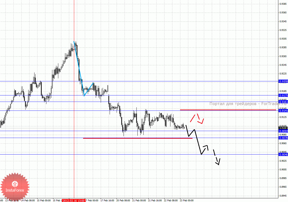 По паре Доллар/Франк ключевым уровня являются: 0.9208, 0.9175, 0.9161, 0.9141, 0.9094, 0.9078 и 0.9040. Здесь продолжения движения книзу ожидаем после прохода ценой шумового диапазона 0.9094 – 0.9078, в данном случае потенциальная цель 0.9040, по достижении этого уровня ожидаем консолидацию. Пробой уровня 0.9141 будет сопровождаться краткосрочным восходящим движением, здесь потенциальная цель 0.9161, в коридоре 0.9161 – 0.9175 консолидация цены. Пробой уровня 0.9175 будет располагать к развитию восходящей структуры, в данном случае потенциальная цель 0.9208, до этого уровня мы ожидаем оформления начальных условий для восходящего цикла.