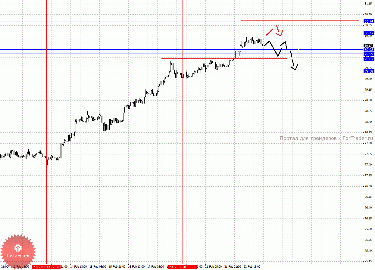 По паре Доллар/Йена ключевыми уровнями являются: 80.74, 80.47, 80.08, 79.99, 79.87 и 79.58. Здесь потенциал для верха достаточно ограничен, и для продолжения общей восходящей тенденции от 1 февраля мы ожидаем оформления более выраженных начальных условий. Пробой уровня 80.47 будет сопровождаться краткосрочным восходящим движением, в данном случае потенциальная цель 80.74, однако уровень может быть не достигнут ценой. Корректировочное движение книзу ожидаем в коридоре 80.08 – 79.99, пробой последнего значения позволит рассчитывать на движение к 79.87, пробой которого, в свою очередь, будет располагать к формированию нисходящей структуры в масштабе Н1, здесь потенциальная цель 79.58.