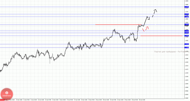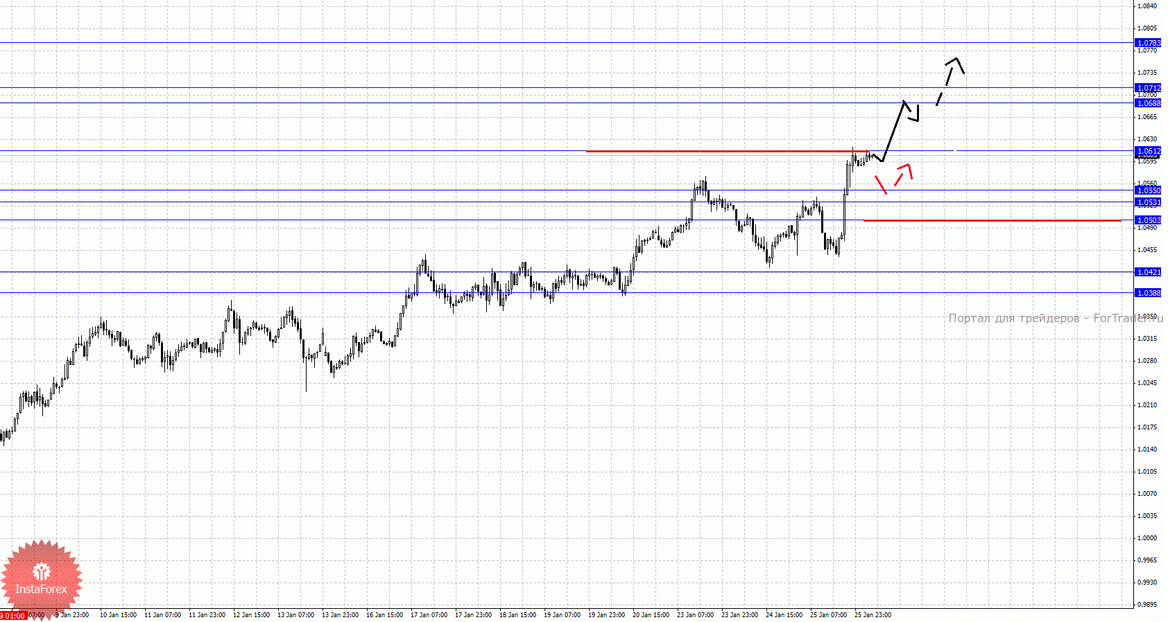 По паре Австралийский доллар/Доллар ключевыми уровнями являются: 1.0783, 1.0712, 1.0688, 1.0612, 1.0550, 1.0531, 1.0503, 1.0421 и 1.0388. Здесь мы продолжаем следить за восходящей структурой от 9 января. Продолжения движения кверху ожидаем после пробоя 1.0612, в данном случае цель 1.0688, в коридоре 1.0688 – 1.0712 консолидация цены. Потенциальным значением для верха считаем уровень 1.0783, движение к которому ожидаем после пробоя 1.0712. Корректировочное нисходящее движение возможно в коридоре 1.0550 – 1.0531, пробой последнего значения приведет к углубленной коррекции, здесь цель – 1.0503, от этого уровня высока вероятность разворота кверху, его пробой окажет негативное влияние на развитие восходящей тенденции в масштабе Н1. Уровни 1.0421 и 1.0388 пока интересны с точки зрения среднесрочной перспективы.