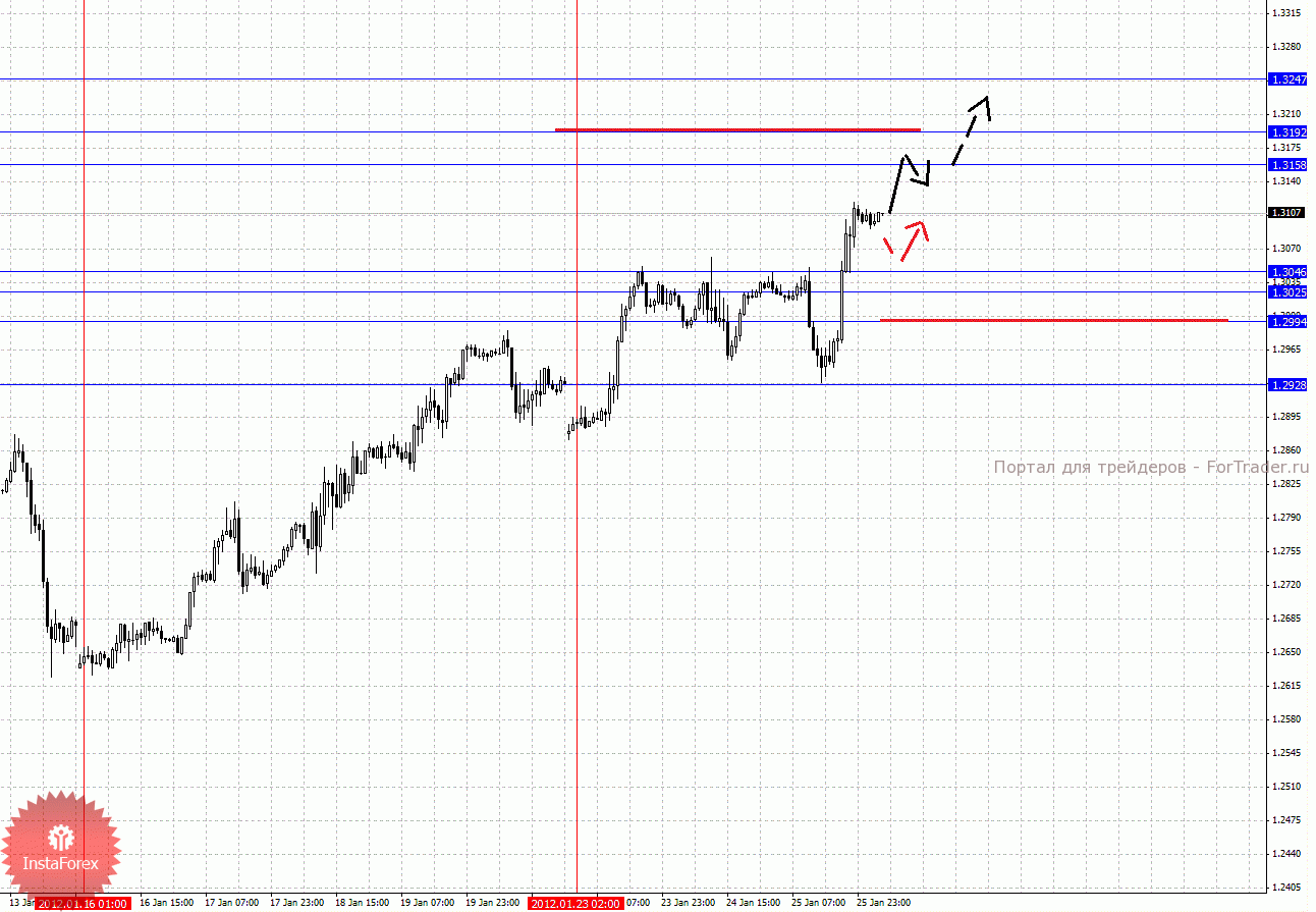 По паре Евро/Доллар важными уровнями являются: 1.3247, 1.3192, 1.3158, 1.3046, 1.3025, 1.2994 и 1.2928. Здесь мы следим за развитием локальной восходящей структуры от 23 января. Краткосрочное движение кверху ожидаем в коридоре 1.3158 – 1.3192, пробой последнего значения должен сопровождаться выраженным восходящим движением в данном случае потенциальная цель – 1.3247, по достижении этого уровня ожидаем откат книзу. Краткосрочное нисходящее движение возможно в диапазоне 1.3046 – 1.3025, пробой последнего значения приведет к углубленной коррекции, здесь цель 1.2994, от этого уровня существует вероятность разворота кверху, его пробой окажет негативное влияние на развитие восходящей тенденции в масштабе Н1, в данном случае потенциальная цель – 1.2928.