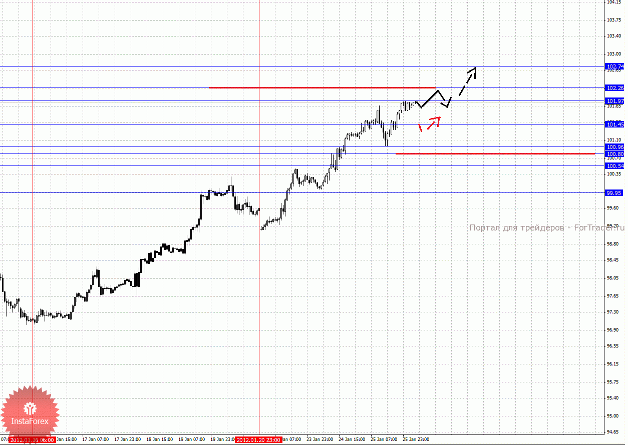 По паре Евро/Йена ключевыми уровнями являются: 102.74, 102.26, 101.97, 101.45, 100.96, 100.80, 100.54 и 99.95. Здесь основные цели остались практически без изменения и мы продолжаем следить за развитием локального восходящего цикла от 20 января. В коридоре 101.97 – 102.26 ожидаем краткосрочное восходящее движение, а также консолидацию цены. Потенциальным значением для верха считаем уровень 102.74, по достижении которого ожидаем откат книзу. Краткосрочное нисходящее движение возможно после пробой 101.45, в данном случае цели не определены. Корректировочное нисходящее движение возможно в коридоре 100.96 – 100.80, пробой последнего значения приведет к углубленной коррекции, здесь цель 100.54, от этого уровня мы ожидаем ключевой разворот кверху, его пробой окажет негативное влияние на развитие восходящей тенденции в масштабе Н1. Уровень 99.95 является ключевой поддержкой для верха и интересен с точки зрения среднесрочной перспективы.