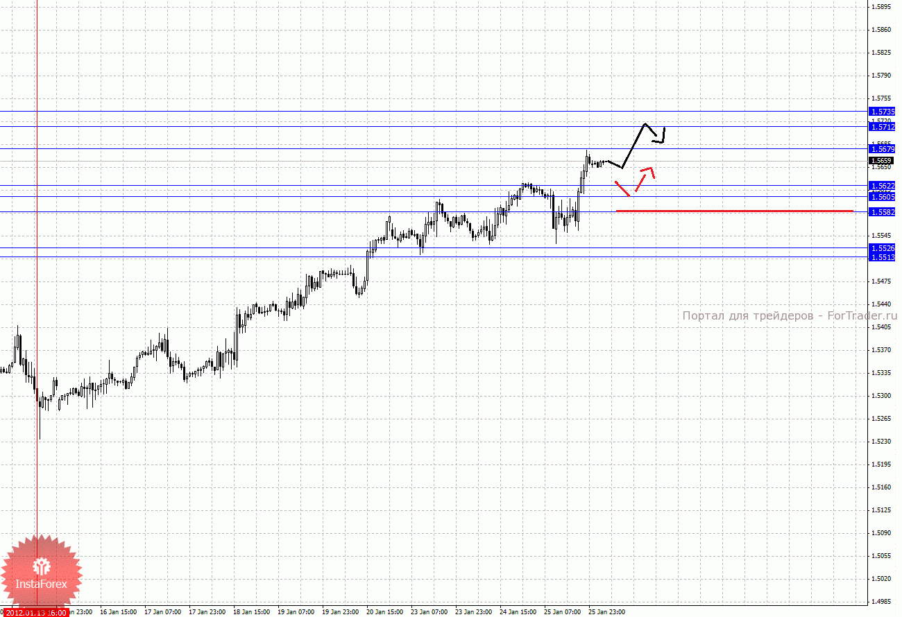 По паре Фунт/Доллар ключевыми уровнями являются: 1.5735, 1.5712, 1.5679, 1.5605, 1.5582, 1.5526 и 1.5513. Здесь мы продолжаем следить за восходящим циклом от 13 января. Продолжения движения кверху ожидаем после пробоя 1.5679, в данном случае цель 1.5712, в коридоре 1.5712 – 1.5735 консолидация цены. Корректировочное нисходящее движение возможно в диапазоне 1.5622 – 1.5605, пробой последнего значения приведет к углубленной коррекции, здесь цель 1.5582, от этого уровня мы ожидаем разворот кверху. Его пробой будет располагать к развитию нисходящей структуры, в данном случае потенциальная цель 1.5526.
