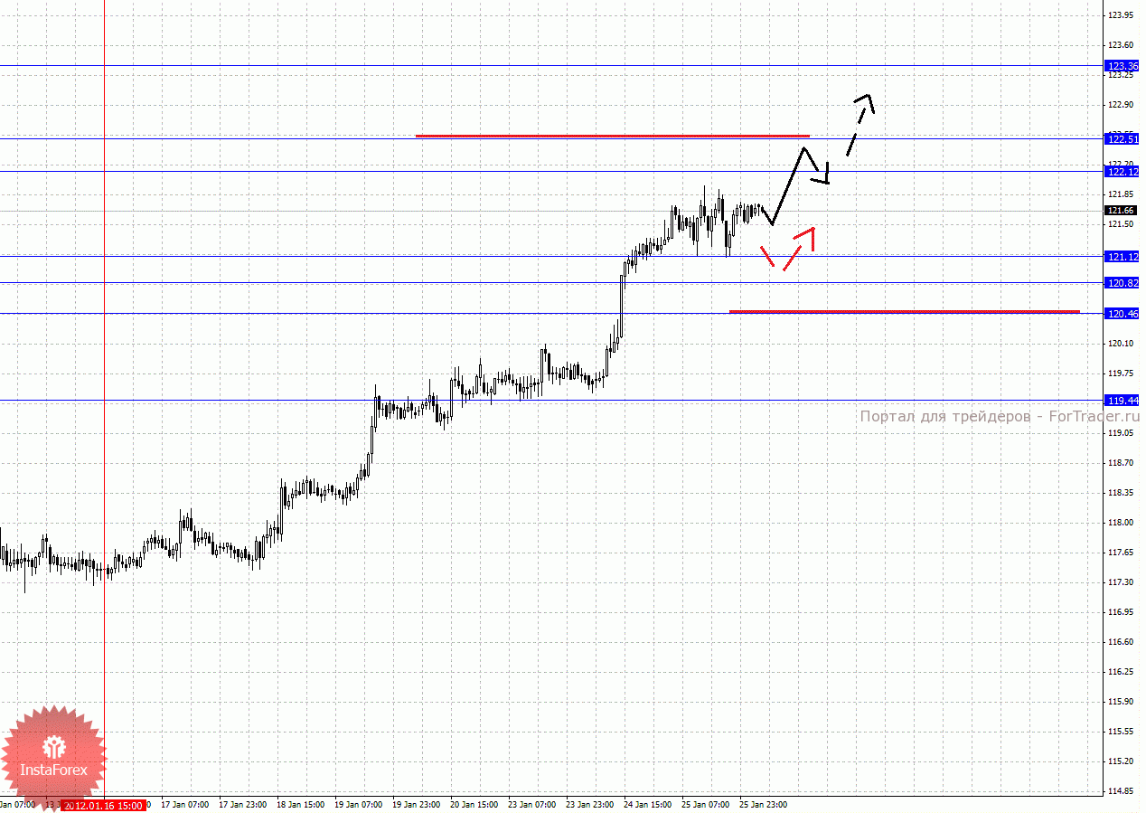 По паре Фунт/Йена ключевыми уровнями являются: 123.36, 122.51, 122.12, 121.12, 120.82, 120.46 и 119.44. Здесь восходящую структуру от 16 января мы рассматриваем в качестве среднесрочных начальных условий. На текущий момент потенциальной целью для верха является уровень 122.12, по достижении которого ожидаем консолидированное движение в диапазоне 122.12 – 122.51. Пробой уровня 122.51 должен сопровождаться выраженным восходящим движением, здесь потенциальная цель 123.36, возле этого уровня мы ожидаем консолидацию. Краткосрочное нисходящее движение возможно в диапазоне 121.12 – 120.82, пробой последнего значения приведет к углубленной коррекции, здесь цель 120.46, от этого уровня высока вероятность разворота кверху, его пробой окажет негативное влияние на развитие восходящей тенденции в масштабе Н1. Уровень 119.44 интересен с точки зрения среднесрочной перспективы.