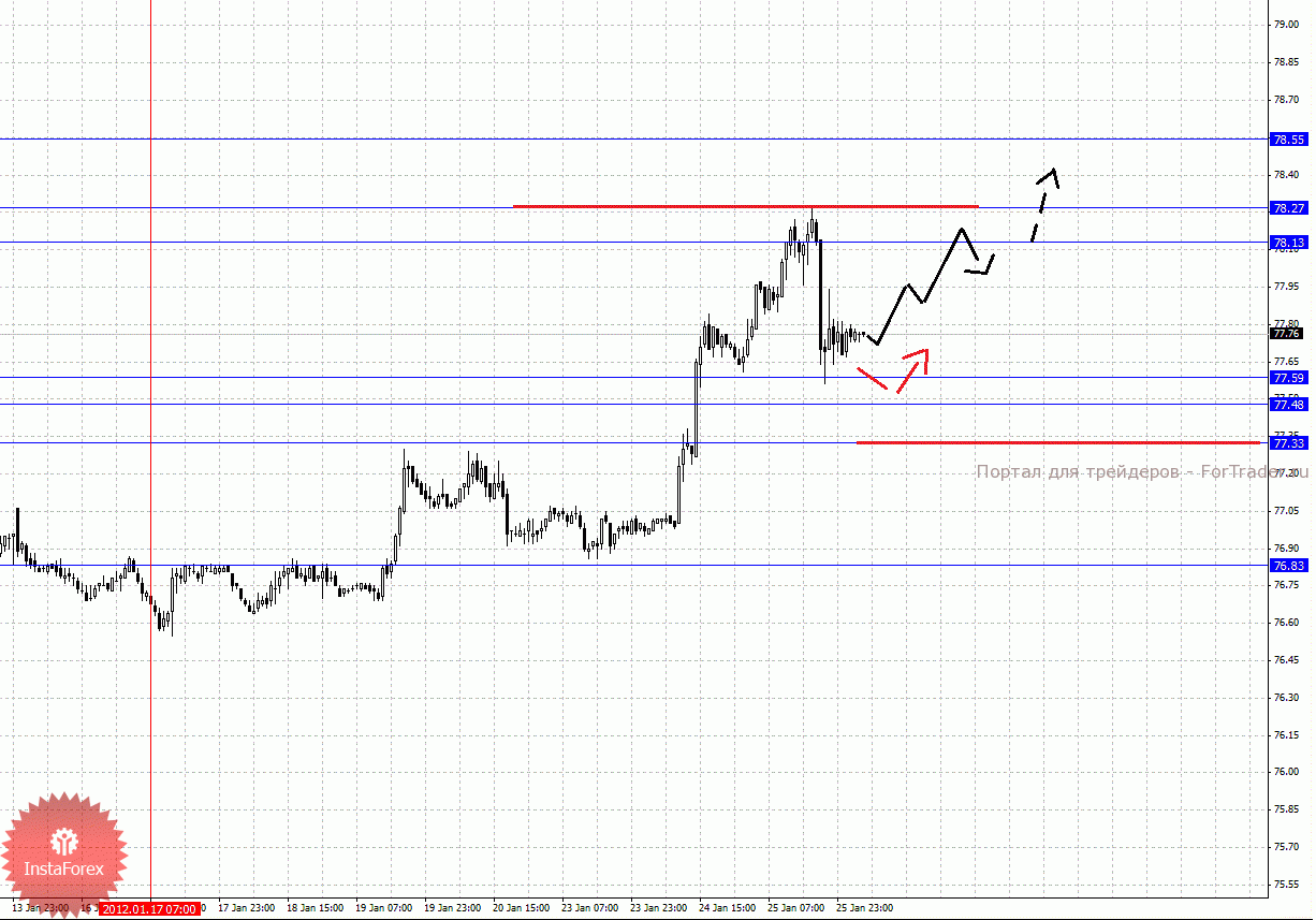 По паре Доллар/Йена ключевыми уровнями являются: 78.55, 78.27, 78.13, 77.59, 77.48, 77.33 и 76.83. Здесь основные цели остались практически без изменения и мы продолжаем следить за восходящим циклом от 17 января. В коридоре 78.13 – 78.27 ожидаем краткосрочное восходящее движение, а также консолидацию цены. Потенциальным значением для верха пока считаем уровень 78.55, движение к которому ожидаем после пробоя 78.27. Корректировочное нисходящее движение возможно в коридоре 77.59 – 77.48, пробой последнего значения приведет к углубленной коррекции, здесь цель 77.33, от этого уровня высока вероятность разворота кверху, его пробой окажет негативное влияние на развитие восходящей тенденции в масштабе Н1.