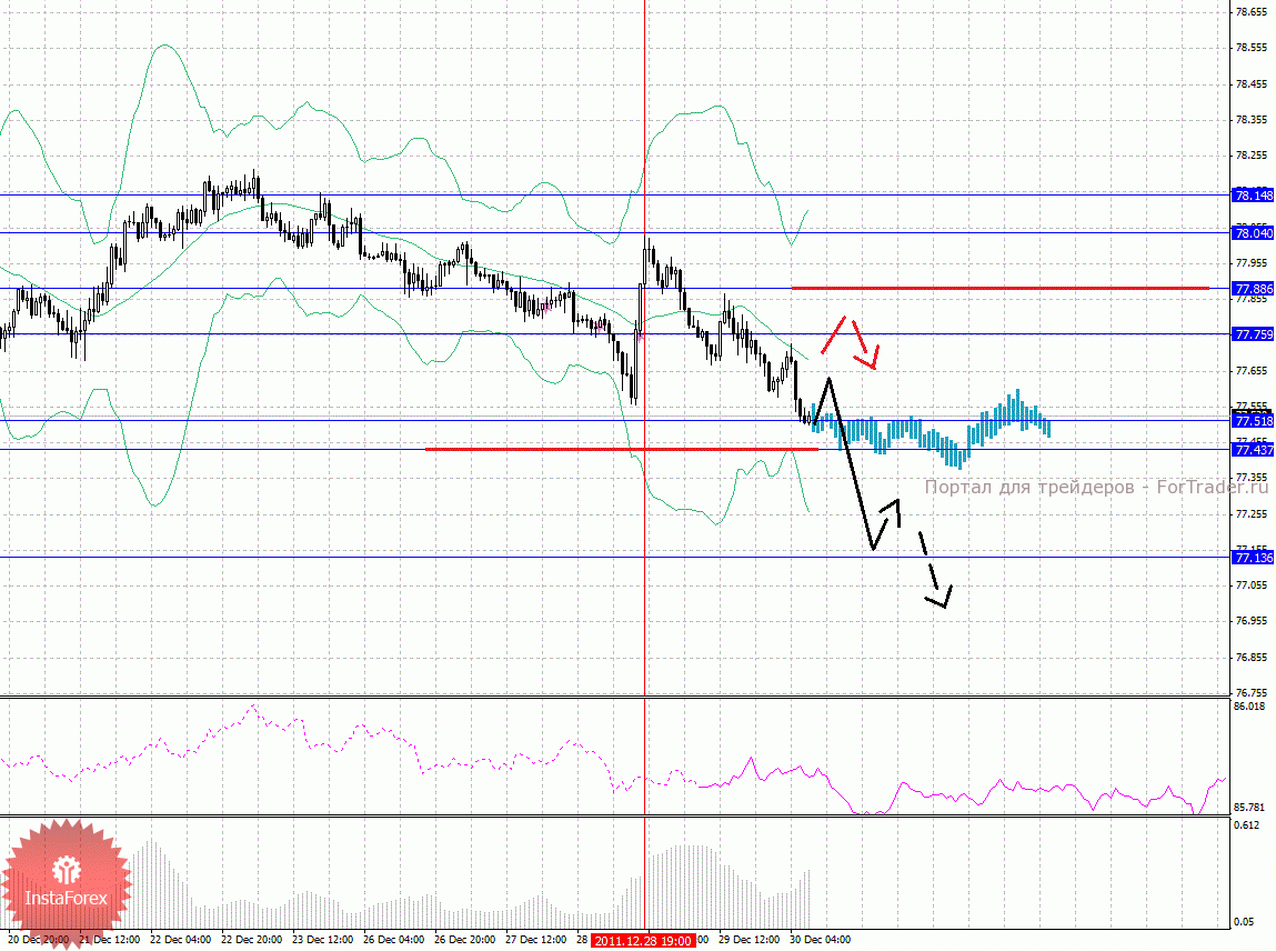 По паре Доллар/Йена ключевыми уровнями являются: 78.14, 78.04, 77.88, 77.75, 77.51, 77.43 и 77.13. Здесь цена отменила восходящую структуру и создала локальные начальные условия для продолжения движения книзу от 28 декабря. Краткосрочное нисходящее движение ожидаем в диапазоне 77.51 – 77.43, пробой последнего значения должен сопровождаться импульсивным движением к потенциальной цели – 77.13, по достижении этого уровня ожидаем откат кверху. Краткосрочное восходящее движение возможно в коридоре 77.75 – 77.88, пробой последнего значения будет располагать к развитию восходящей структуры, в данном случае первая цель 78.04. Потенциальным значением для верха считаем уровень 78.14, по достижении которого, ожидаем консолидацию.