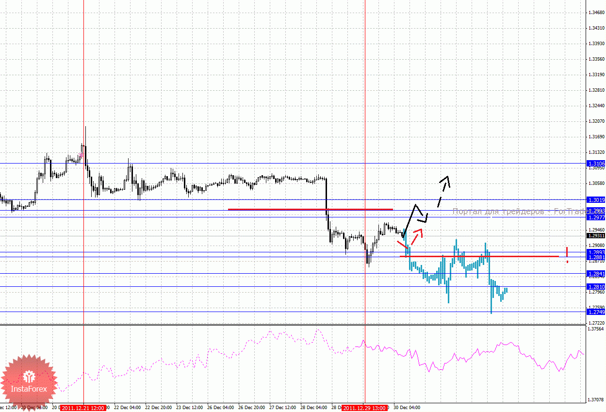 По паре Евро/Доллар важными уровнями являются: 1.3106, 1.3019, 1.2993, 1.2977, 1.2893, 1.2881, 1.2841, 1.2810 и 1.2749. Здесь ключевые цели пока остаются без изменения. Продолжения нисходящей структуры от 21 декабря ожидаем после пробоя 1.2881, в данном случае цель 1.2841, в коридоре 1.2841 – 1.2810 консолидация цены. Потенциальным значением для низа считаем уровень 1.2749, по достижении которого, ожидаем откат к верху. Корректировочное восходящее движение возможно в коридоре 1.2977 – 1.2993, пробой последнего значения приведет к углубленной коррекции, здесь цель 1.3019, от этого уровня существует вероятность разворота книзу. Пробой 1.3019 будет располагать к развитию восходящей структуры и в данном случае потенциальная цель 1.3106. Также, уважаемые трейдеры, обратите внимание на развитие ситуации по главному индексу Доу Джонс, где существует потенциал для развития верха (обзор на форуме).