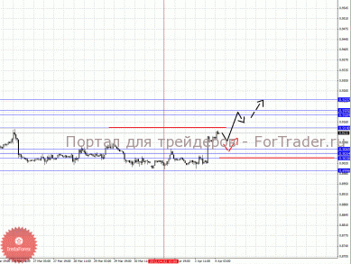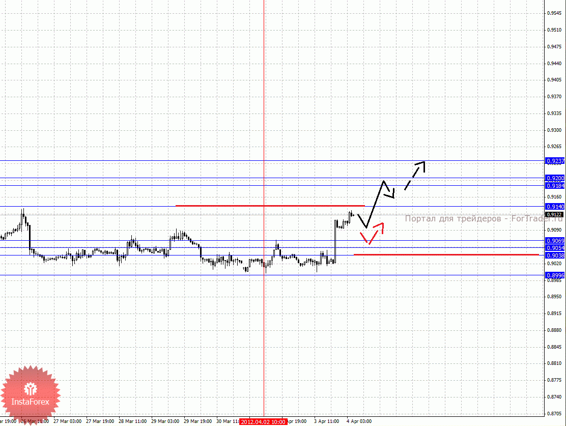 По паре Доллар/Франк ключевым уровня являются: 0.9237, 0.9200, 0.9184, 0.9140, 0.9069, 0.9054, 0.9038 и 0.8996. Здесь продолжения развития восходящей структуры от 2 апреля ожидаем после пробоя уровня 0.9140, в данном случае цель 0.9184, в коридоре 0.9184 – 0.9200 консолидация цены. Потенциальным значением для верха считаем уровень 0.9237, по достижении которого, ожидаем откат книзу. Корректировочное нисходящее движение возможно в коридоре 0.9069 – 0.9054, пробой последнего значения приведет к углубленной коррекции, в данном случае цель – 0.9038, пробой которой, в свою очередь, отменит развитие восходящей структуры от 2 апреля, в данном случае потенциальная цель – 0.8996.